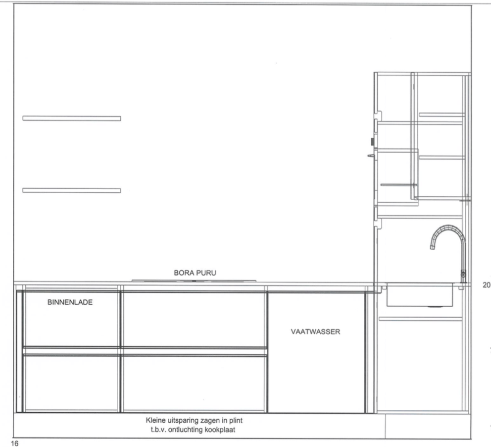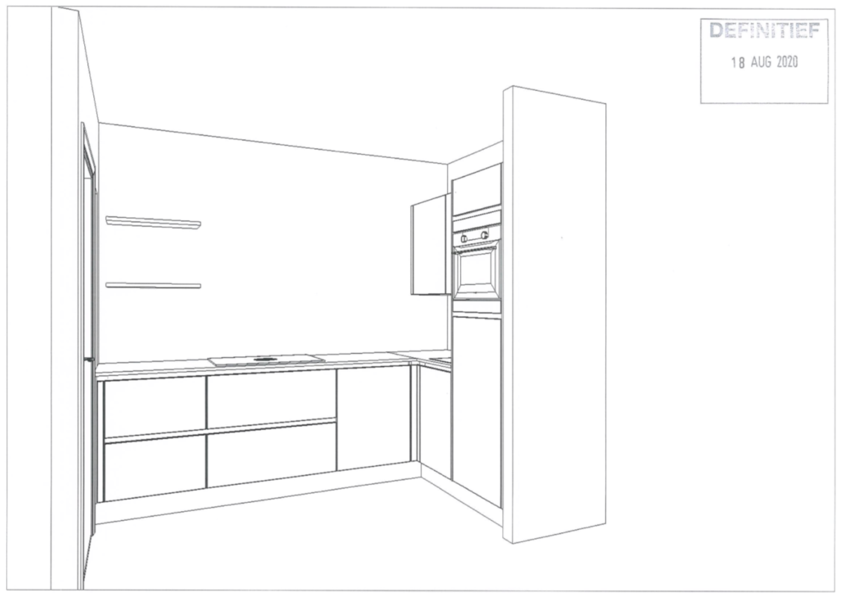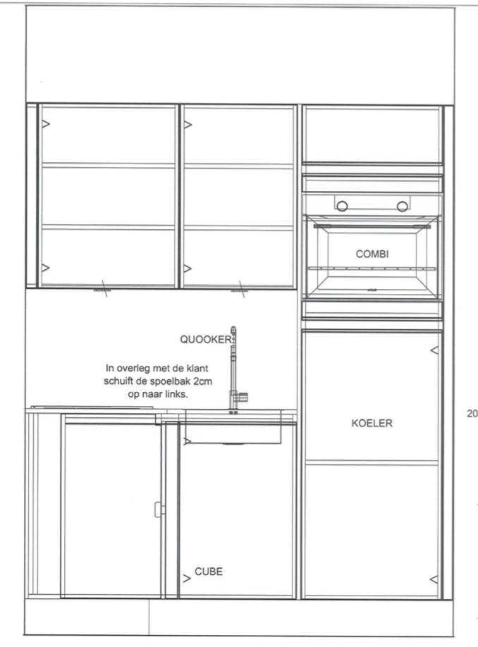 We hebben op deze manier iets meer kastruimte omdat we ook boven twee kastjes krijgen, wat we nu niet hebben. Met deze ruimte kunnen we niet megaveel, het is nu eenmaal wat aan de kleine kant, maar wij denken dat dit de meest ideale indeling is. Een eiland of zo is geen mogelijkheid, daarvoor is het hier allemaal net niet ruim genoeg.