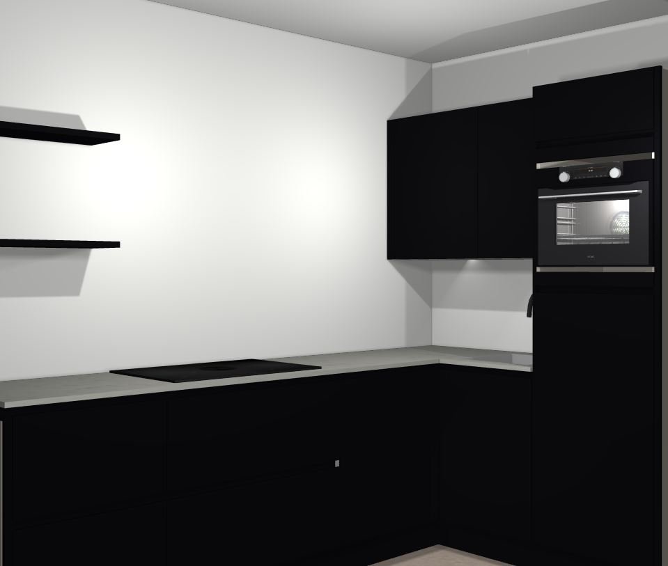 Dit gaat het worden! De indeling is wat anders geworden zoals je ziet, de koelkast en oven zijn verplaatst naar een plek waar ze in ieder geval niet voor het raam staan. Het materiaal van de kastjes is mat zwart en we hebben een natuurstenen lichtgrijs werkblad. Op de muur komen tegels, maar die moeten we nog uitzoeken (en die komen er toch pas in als de keuken er eenmaal in zit). Geel komt trouwens niet terug! Ik zit te denken aan gebroken wit geglazuurde visgraat tegels, maar we hebben nog niet officieel gekozen.