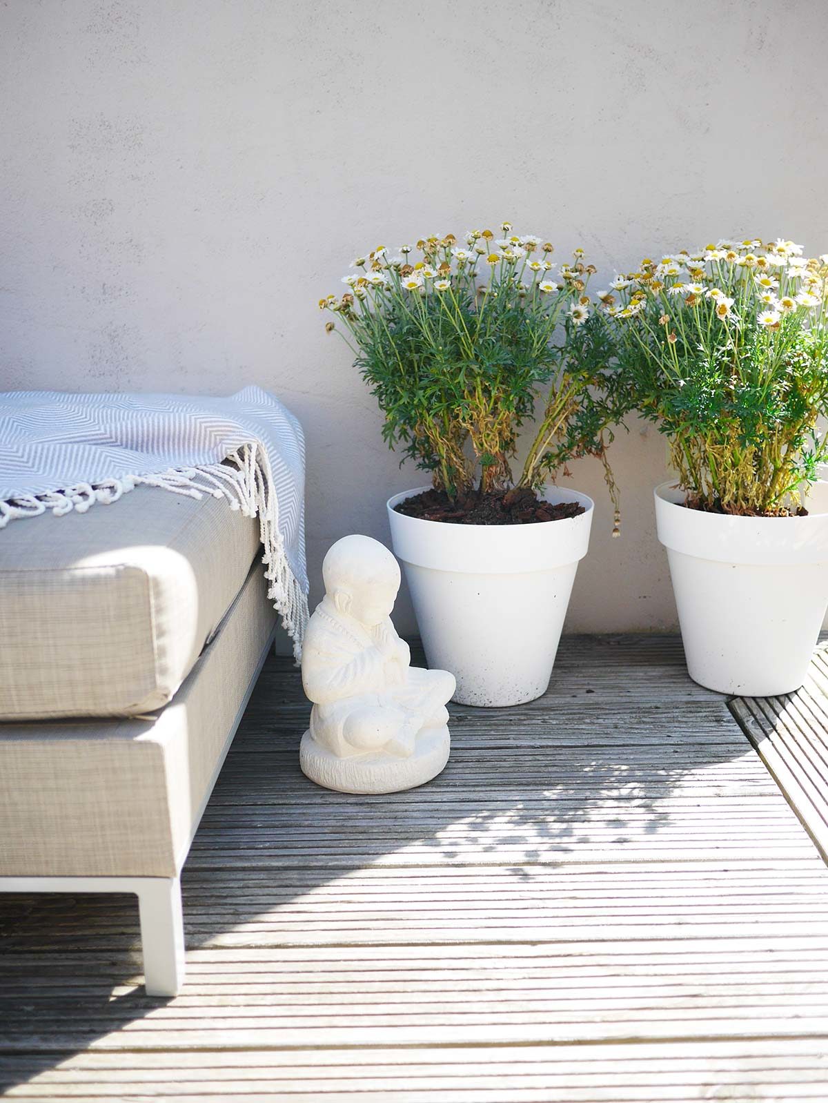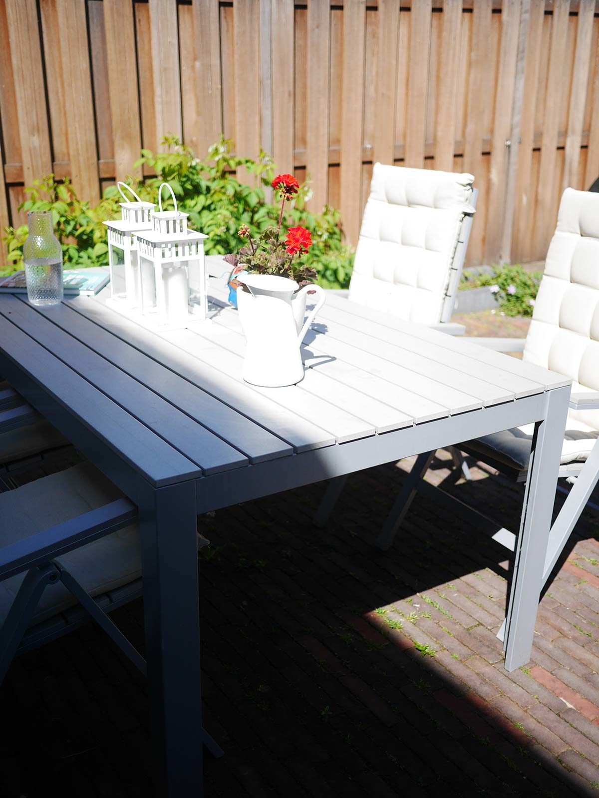 Ik ben erg blij met onze tuin. Het is nu wel zoals ik me het had voorgesteld met die heerlijke lounge-hoek. Het is erg fijn om meerdere zitplekjes te hebben, zoals de loungebank, de eettafel en het houten bankje – zo kan ik met de zon of de schaduw meebewegen en dat is wel erg lekker. We hebben alleen nog een goede parasol nodig en ooit zou ik het wel mooi vinden om een lameloverkapping op het terras te hebben – maar dat is iets voor later. Met lekker weer ben ik de hele dag buiten, ik geniet zo van onze tuin!
