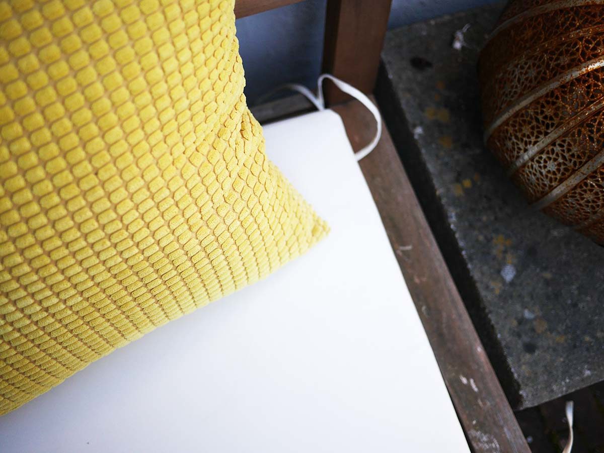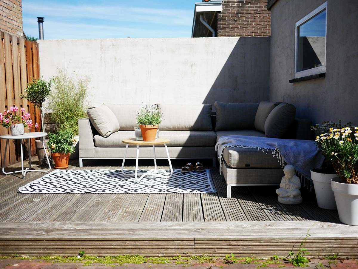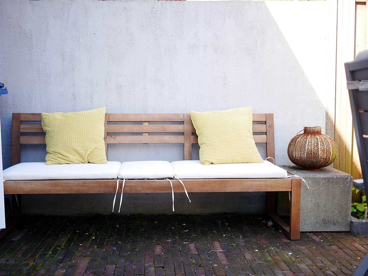 Dan de ‘zithoek’ die net af is. Ik wist al sinds het begin dat ik een mooie loungebank wilde, maar vond niks wat me beviel. Steigerhout vind ik wat te grof, goedkopere sets niet comfortabel genoeg óf dan vond ik ze gewoon niet mooi – en als ik dan bij een Karwei of Leen Bakker een mooie set zag, was die al snel €1500. Na een tijd zoeken kwam ik de bank tegen die ik meteen prachtig vond. Ik heb de loungehoek meteen gezellig gemaakt – ik had de smaak meteen te pakken.