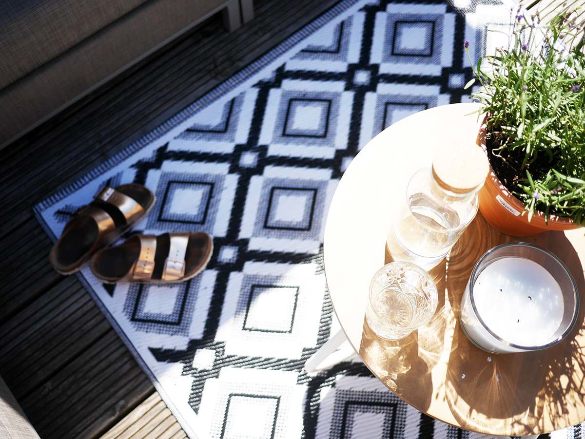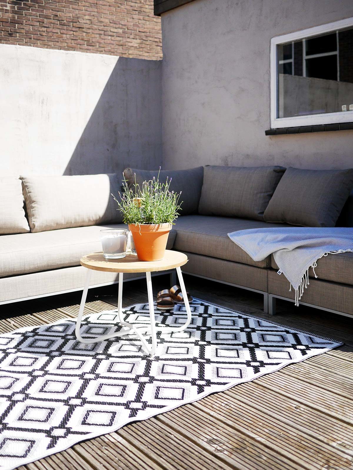 Het buitenkleed (van kunststof, dus kan ook buiten blijven) is van Wehkamp.