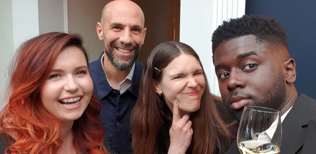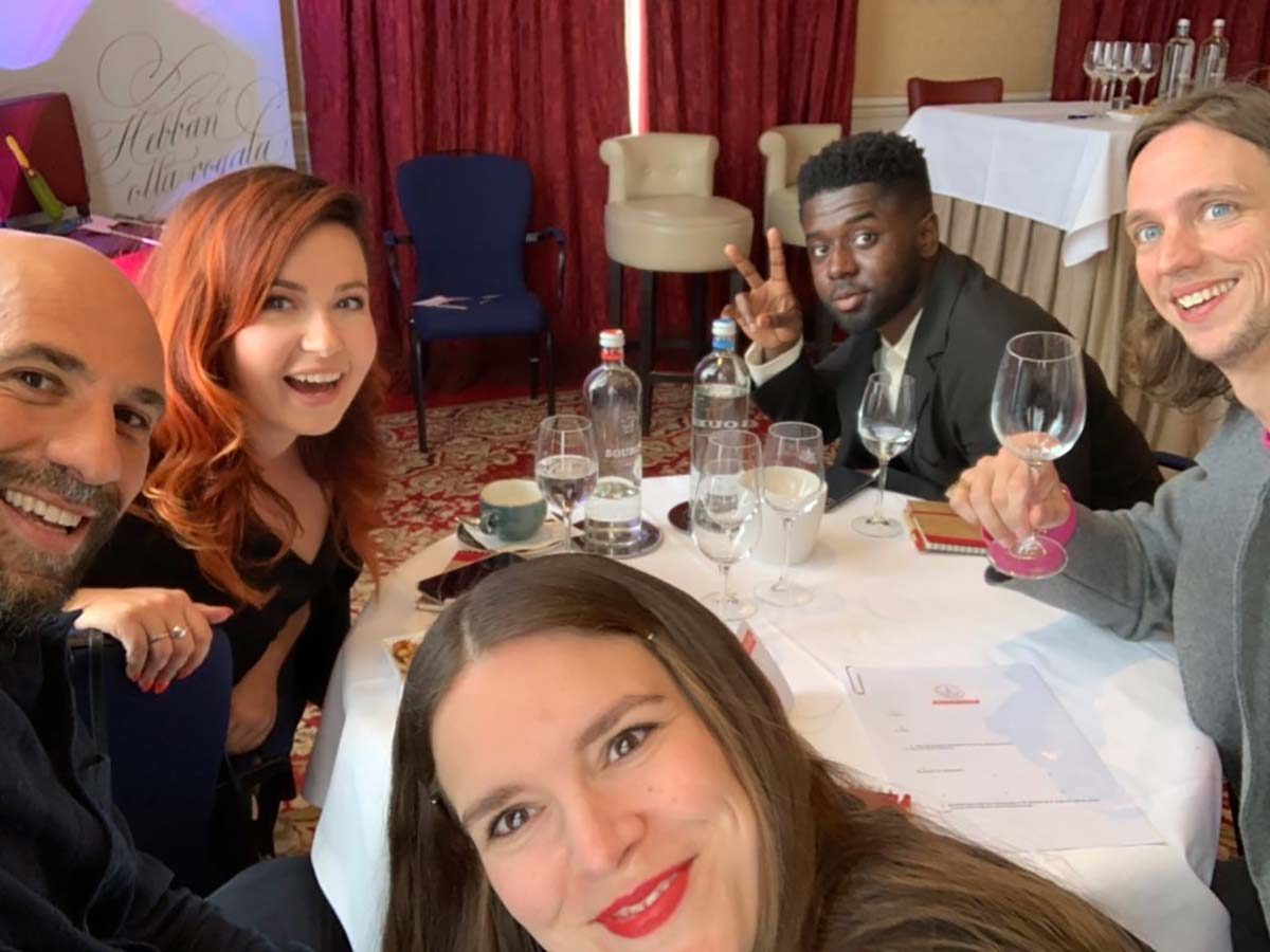 De borrel begint, we mogen bijna aan tafel. Ik kende mijn mede-ambassadeurs voor vanavond nog niet, maar zoals je ziet is het meteen gezellig. Pepijn is spoorloos inmiddels dus de selfie is even zonder hem.