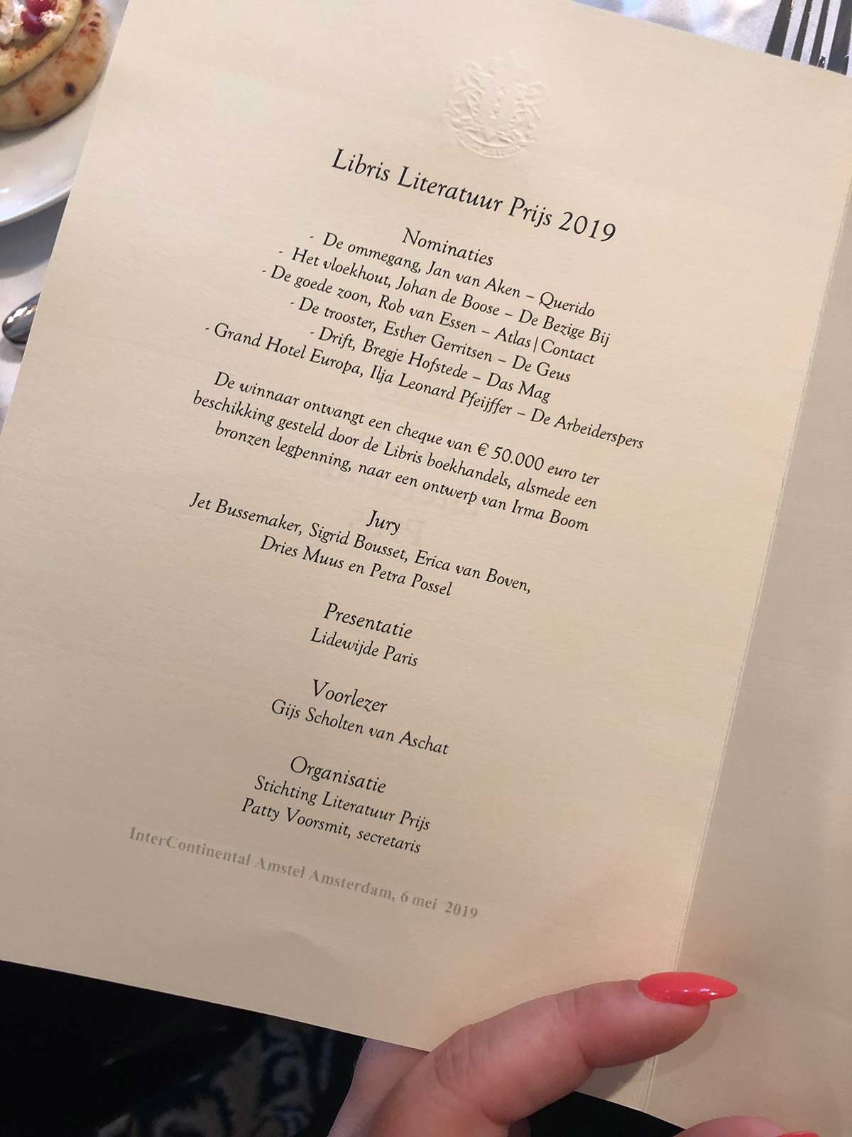 Na de uitreiking praten we na en mijn conclusie samen met Alma is: het is een stuk minder chic en stijf dan we vooraf hadden gedacht. Het is gezellig, het is een tikje chaotisch, iedereen is aardig en toegankelijk, vriendelijk en staat open voor vragen en gesprek. Zo krijg ik van Abdelkader Benali waar ik naast zit goed advies over schrijven (hij heeft 20 boeken geschreven!) en ook Alma vertelt openhartig over haar schrijversbestaan. Ik geniet er met volle teugen van. Wat een eer om hier bij te mogen zijn en mee te mogen maken hoe de uitreiking van de Libris Literatuurprijs er aan toegaat. Bedankt Libris.