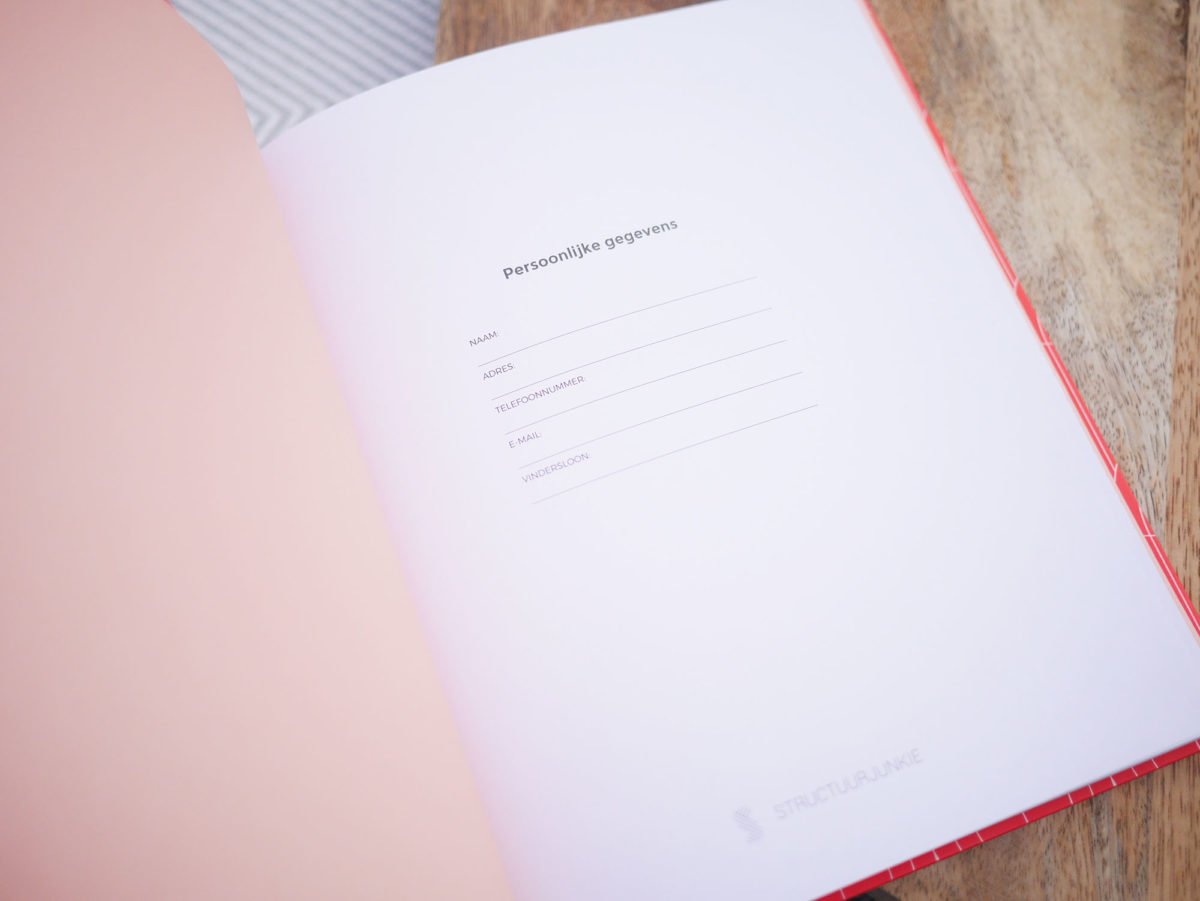 Hieronder alle foto’s van de binnenkant van de ‘oude vertrouwde’ (kleine) Structuurjunkie Planner 2020/2021 (18,6 x 22cm). Als je op de foto klikt, wordt deze groter.