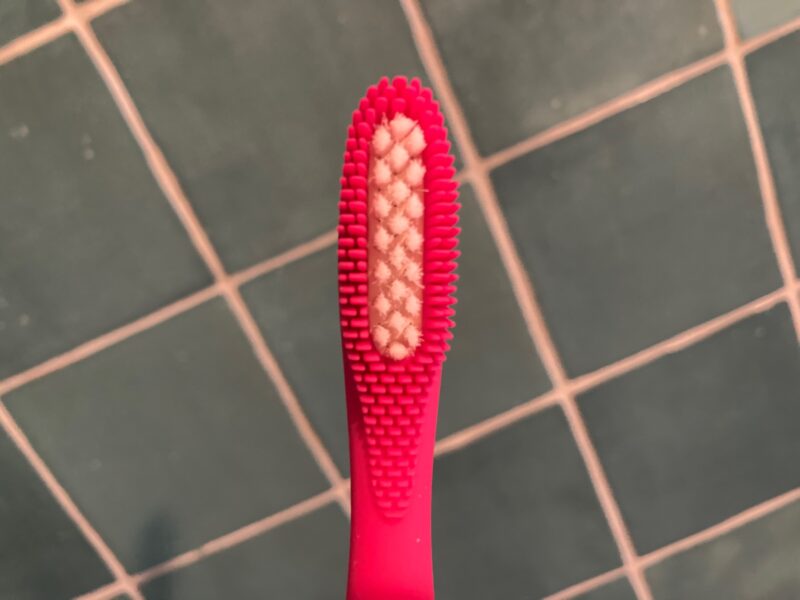 Het borsteltje is ook anders. Hij is langwerpig zoals een ouderwetse tandenborstel en heeft siliconen ‘haartjes’. De borstelkop is flexibel en buigt mee als je harder drukt. Hierdoor kun je hem ook net wat gemakkelijker manoeuvreren op lastige plekjes.