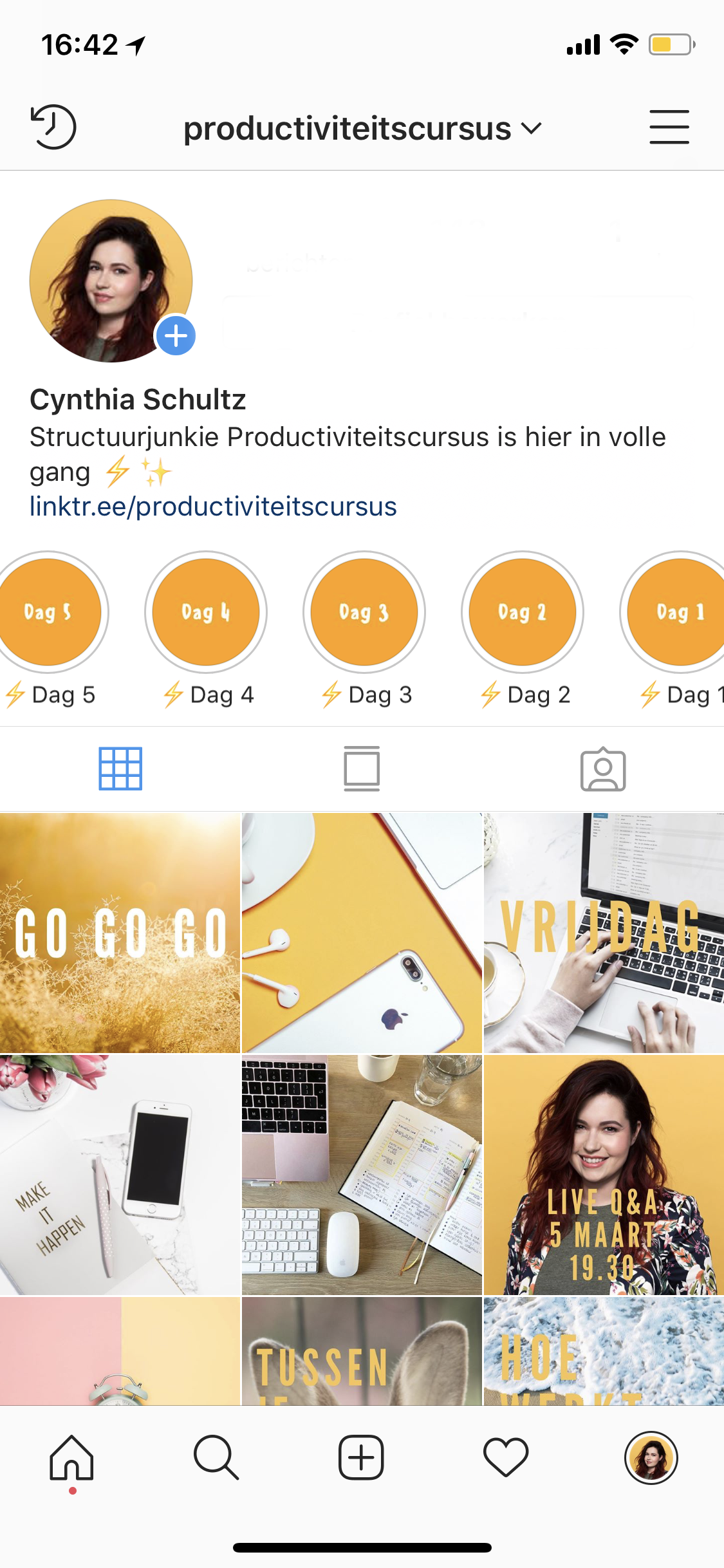 De Structuurjunkie Productiviteitcursus is een cursus die je helemaal volgt op Instagram! Het enige wat je nodig hebt is je telefoon en een Instagramaccount. In de cursus ga ik vijf dagen lang in op alles wat met productiviteit te maken heeft. Door middel van wallposts, Instagram stories en een livesessie van een uur behandel ik allerlei praktische onderwerpen en tips & tricks. Je kan onder de wallposts, in de livesessie en in de daar speciaal voor bedoelde stories (met een vragentool) je vragen stellen, zodat jouw issue besproken wordt.