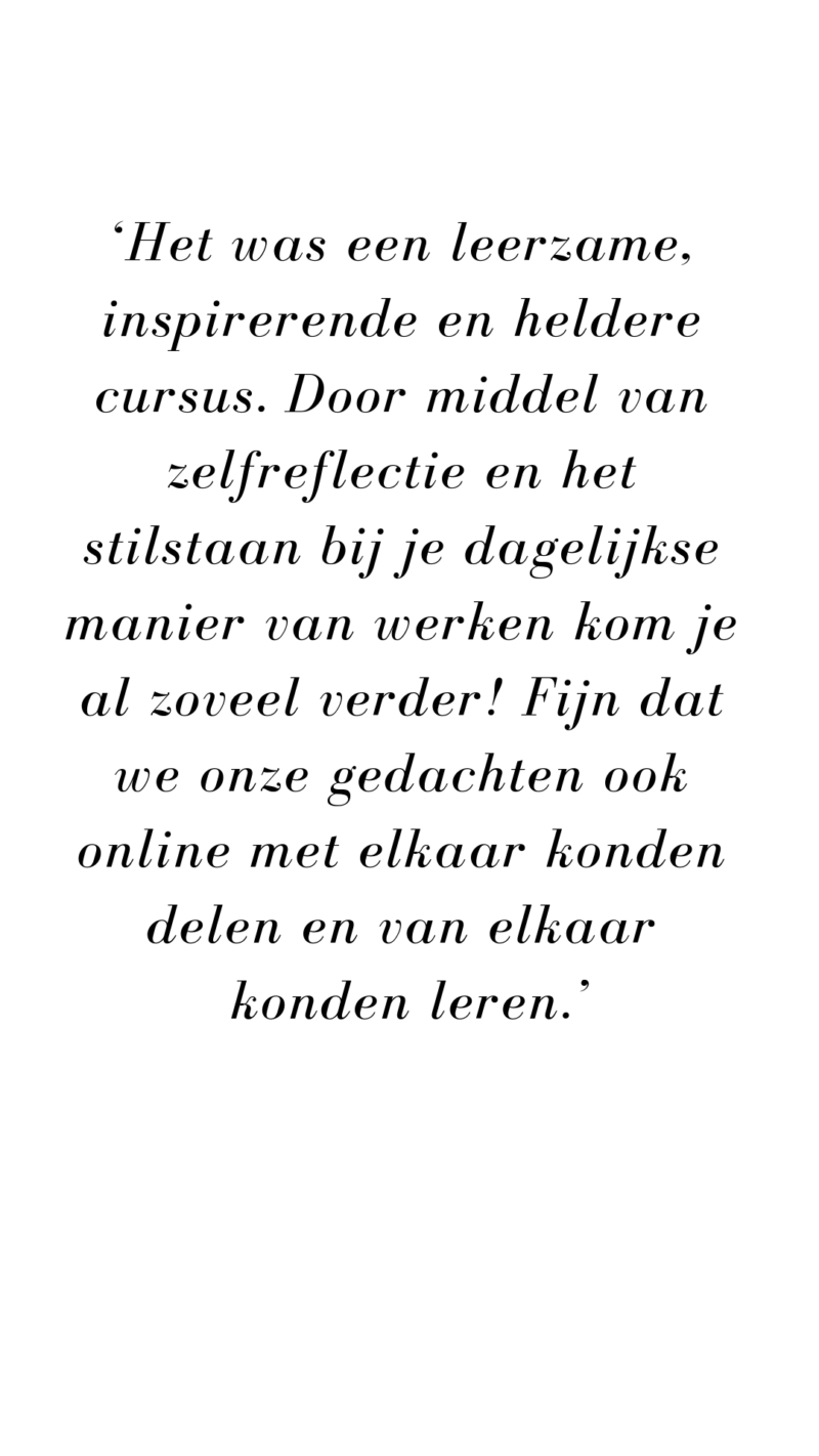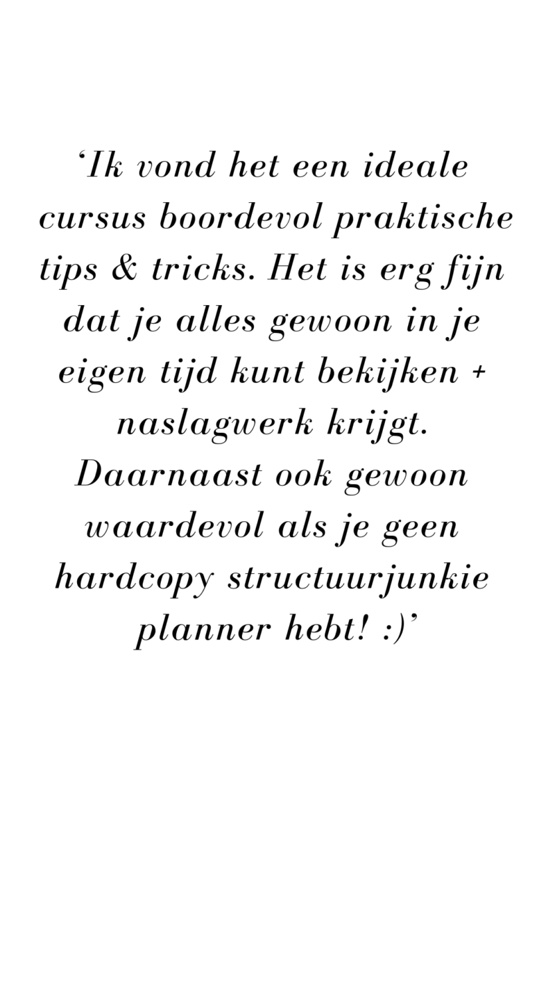 Let op: dit is niet een online Structuurjunkie Masterclass. De inhoud is anders! De Masterclass kan je vooralsnog alleen ‘in real life’ volgen. De Structuurjunkie Productiviteitcursus is een andere cursus. Er is een klein deel overlap, maar deze Instagramcursus gaat vanzelfsprekend veel dieper in op het thema Productiviteit, dat ik in de Masterclass korter behandel. Als je de ‘live’ Structuurjunkie Masterclass gevolgd hebt, krijg je 30% korting op je ticket voor de Instagram Productiviteitscursus. Mail me daarvoor even op structuurjunkie@gmail.com