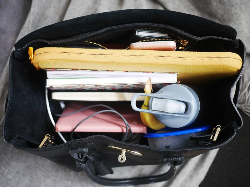 Ik heb meestal twee tassen bij me: een klein handtasje en een grotere stoffen totebag. Maar als werktas neem ik soms ook mijn grotere Mulberry tas mee, daar kan lekker veel in. Het is maar net waar ik zin in heb.