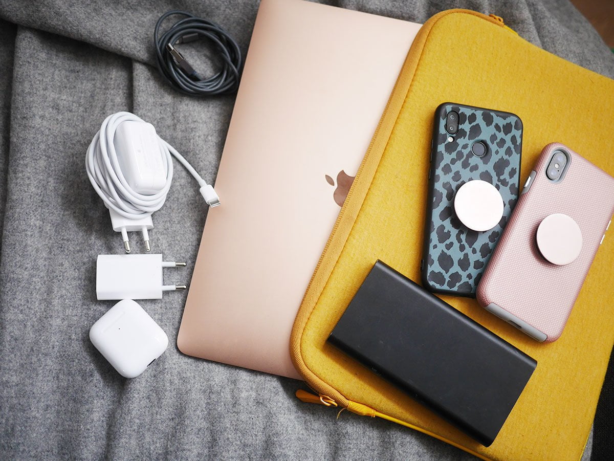 Een powerbank, USB-C kabel (voor mijn MacBook) en een Lightning kabel (voor mijn iPhone) gaan ook altijd mee. En natuurlijk heb ik ook de gewone oplader van mijn MacBook bij me, voor als ik ergens ben met een stopcontact. Het scheelt wel dat ik ongeveer zes tot zeven uur op mijn laptop kan werken tot ‘ie leeg is.