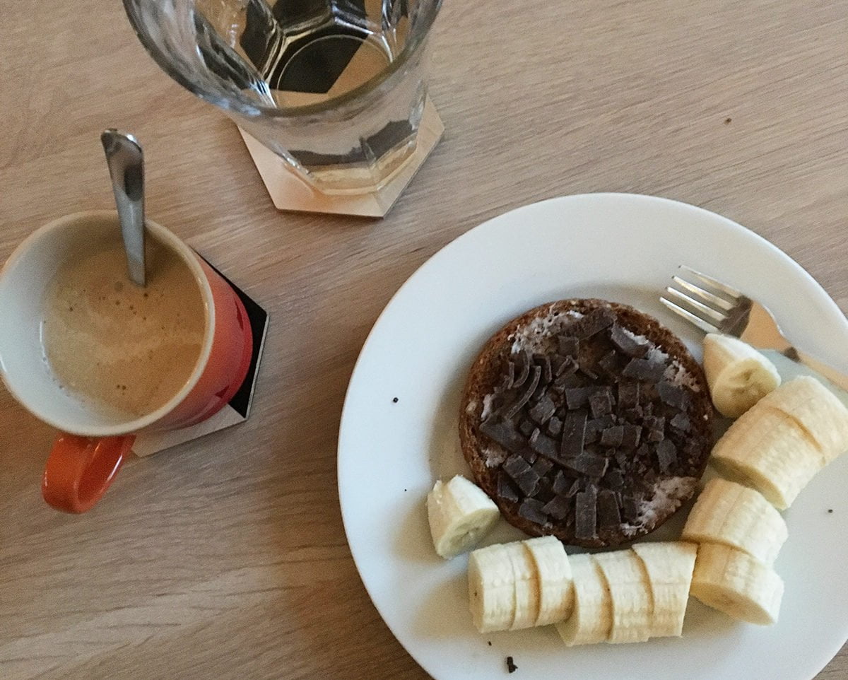It has begun. Ik begin de dag met twee beschuitjes met extra virgin coconut cream met pure hagelslag, een banaan en koffie met amandelmelk. Ik dronk al vaker koffie met amandelmelk en ik vind het niet zo lekker. Ik ben gewoon zo gek op mijn eerste kopje koffie van de dag met warme melk. Nou ja, het is niet zo erg, want mijn beschuitjes zijn super lekker.