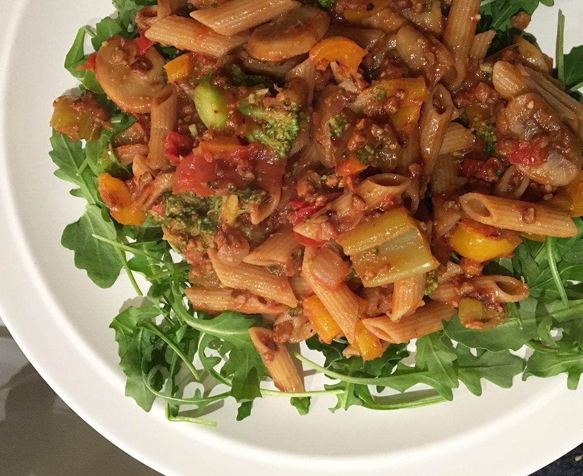 Volkoren pasta met tomatensaus met megaveel groente en rucola