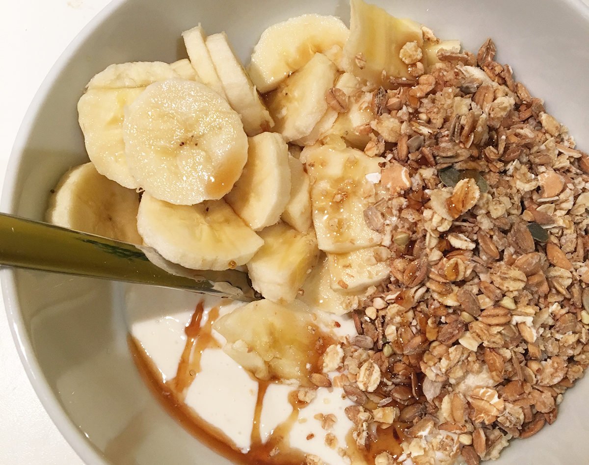 Soja-yoghurt met banaan, muesli en ahornsiroop
