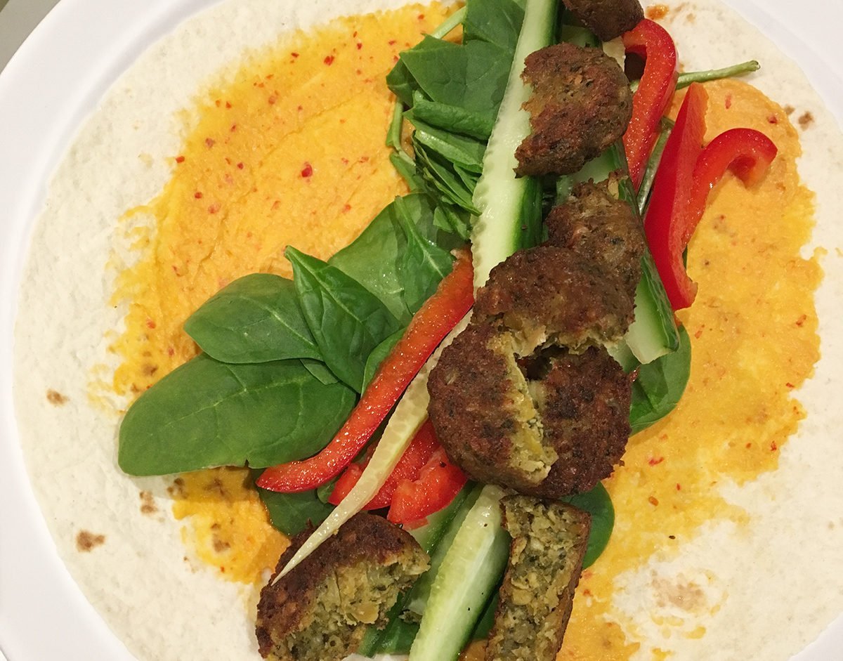 ’s Avonds eten we een gerecht dat ik heel graag eet: wrap met hummus, paprika, komkommer, spinazie en falafel. Dit vind ik mega lekker en ik mis dan ook niks.