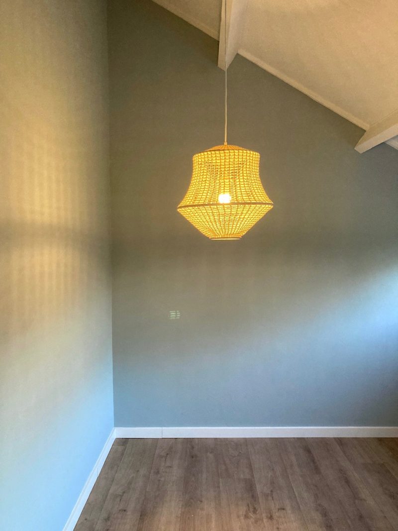 Als er lampen opgehangen worden wordt het ineens een huis. Op de eerste foto zie je een lamp van Kwantum die in onze gang hangt (nog steeds verkrijgbaar) en op de tweede foto zie je onze slaapkamer waar een lamp hangt van Ikea. Deze was destijds LE dus is niet meer verkrijgbaar.