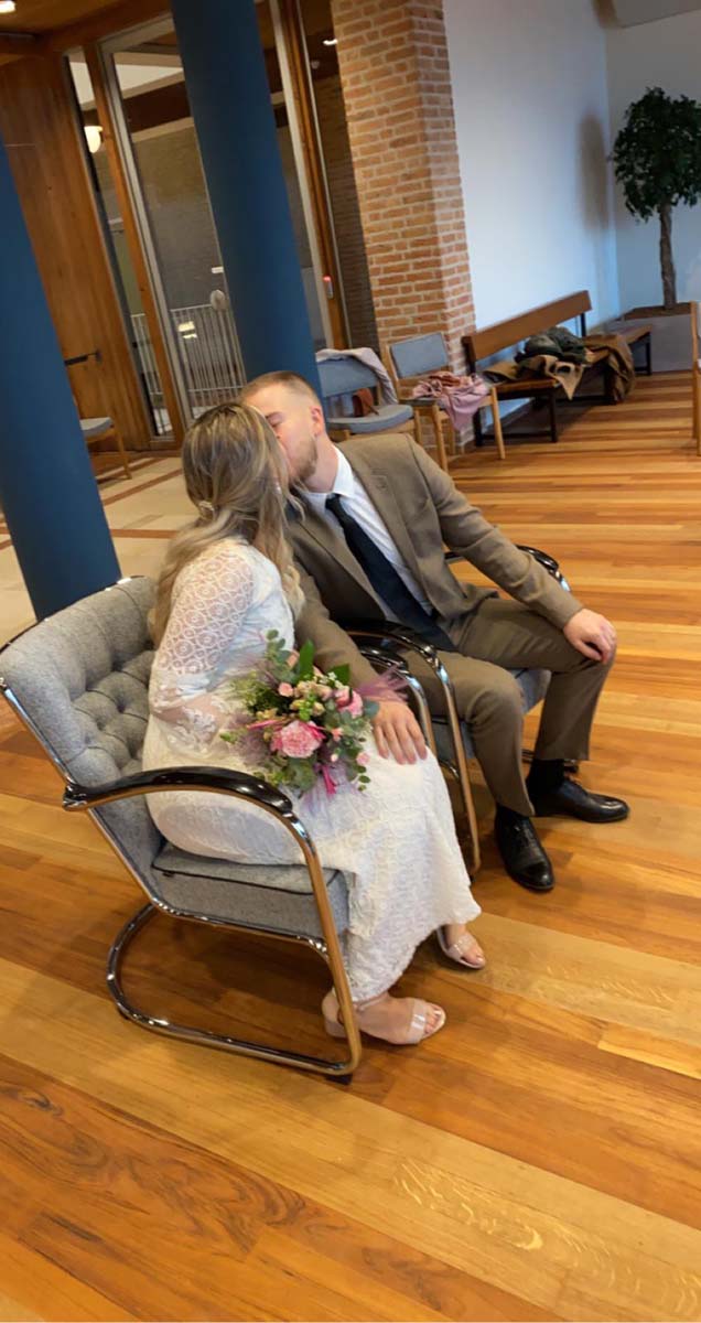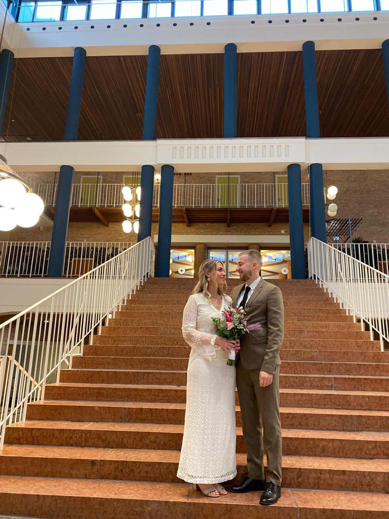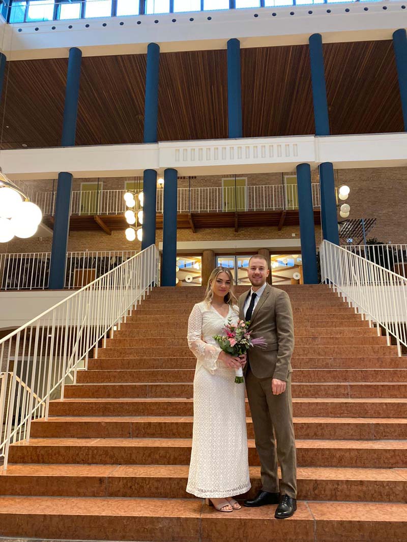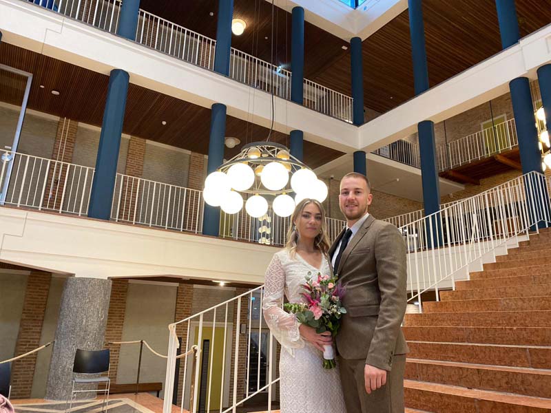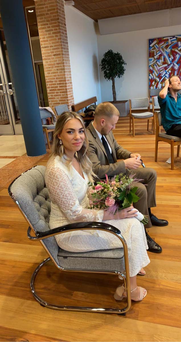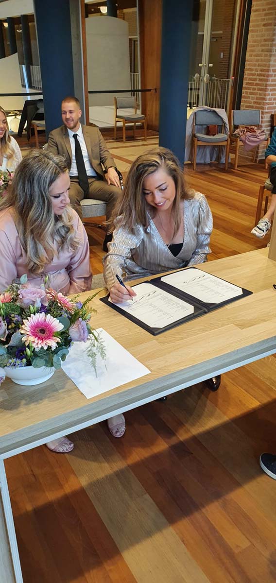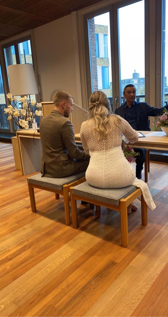 Nadat we beide klaar waren gingen naar het gemeentehuis. Ik was mijn boeketje vergeten (preggobrain) dus we moesten ook nog terug haha, oeps. Gelukkig waren we ruim op tijd. We hebben bewust gekozen voor het moment om gratis te trouwen, dus normaal zit je dan in een sober kantoor. Voor het eerst hadden we voordeel bij Corona, want het kantoortje was te klein en daarom mochten we in de echte trouwzaal. De ambtenaar die ons trouwde was ook nog zo vriendelijk dat de aanhang van de getuigen ook mee naar binnen mochten, iets wat normaal dan ook niet mag. Ook gaf hij ons ruim de tijd om voor en na de tijd nog wat foto’s te maken. Het voelde helemaal niet als een snel en gratis moment. Het voelde heel bijzonder om echt JA tegen elkaar te zeggen.