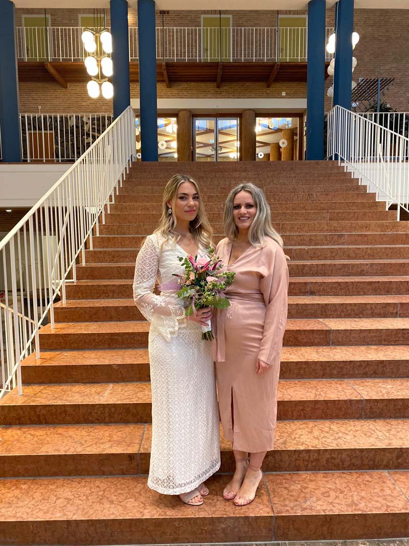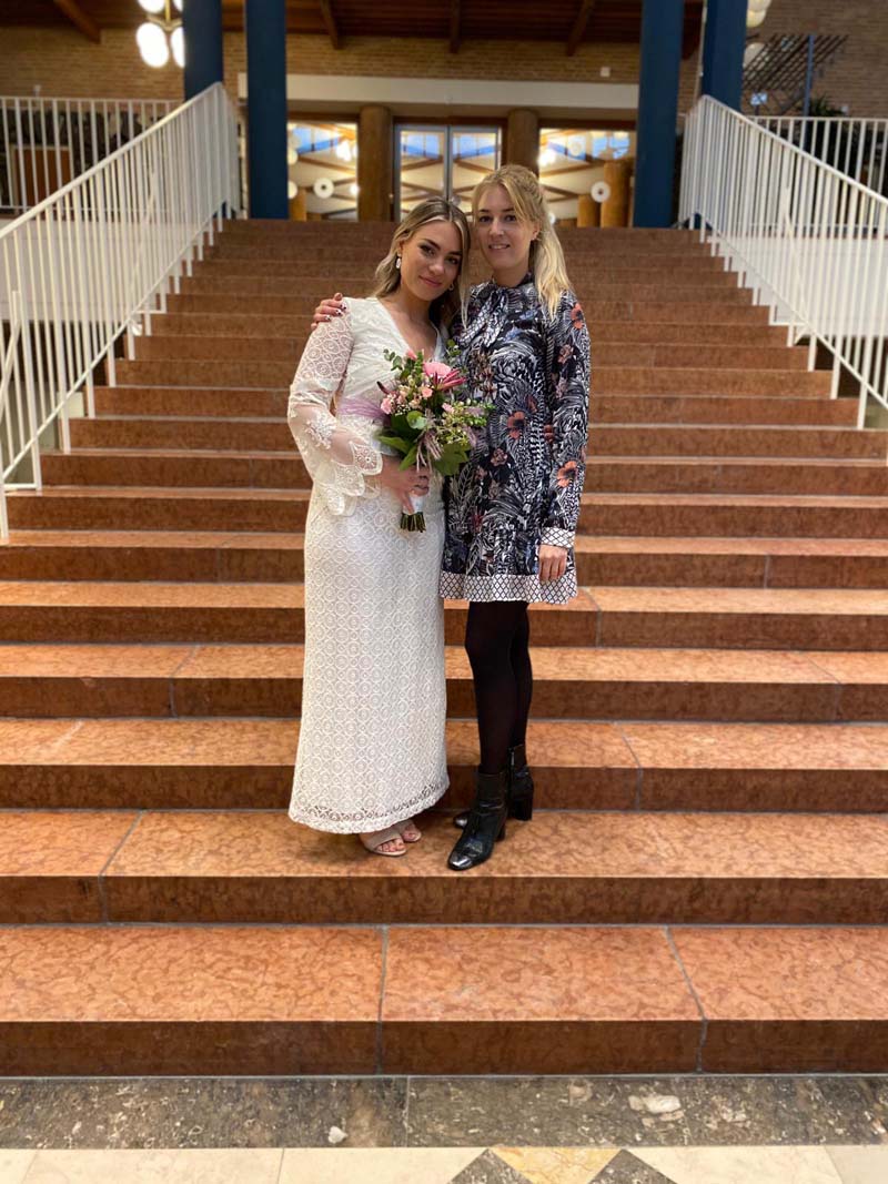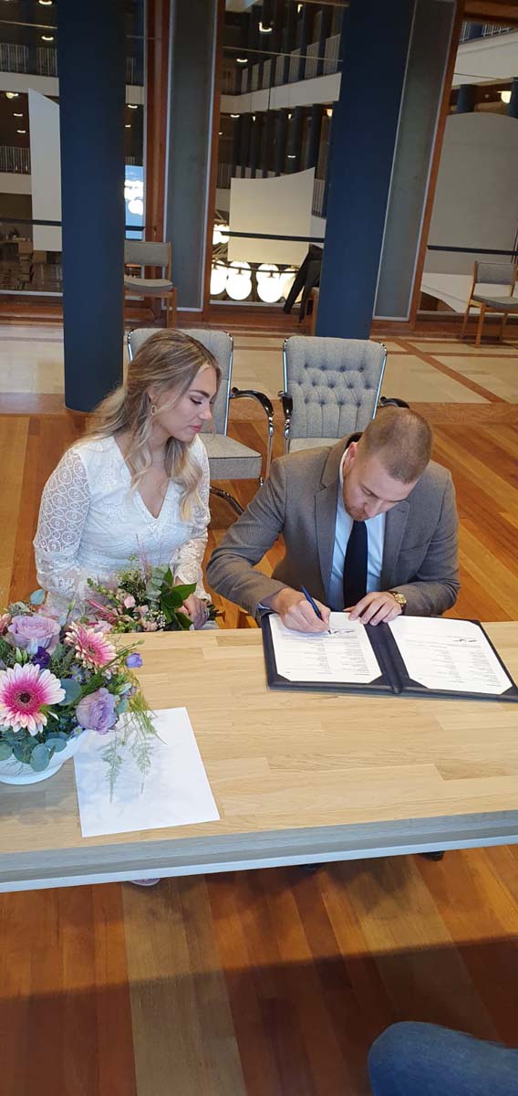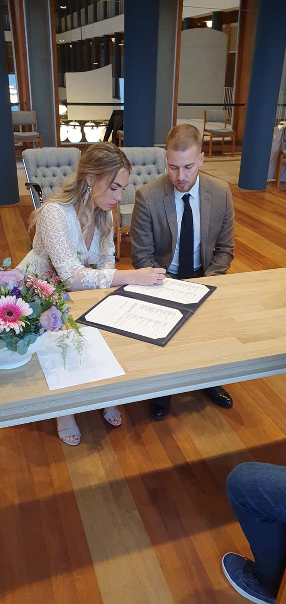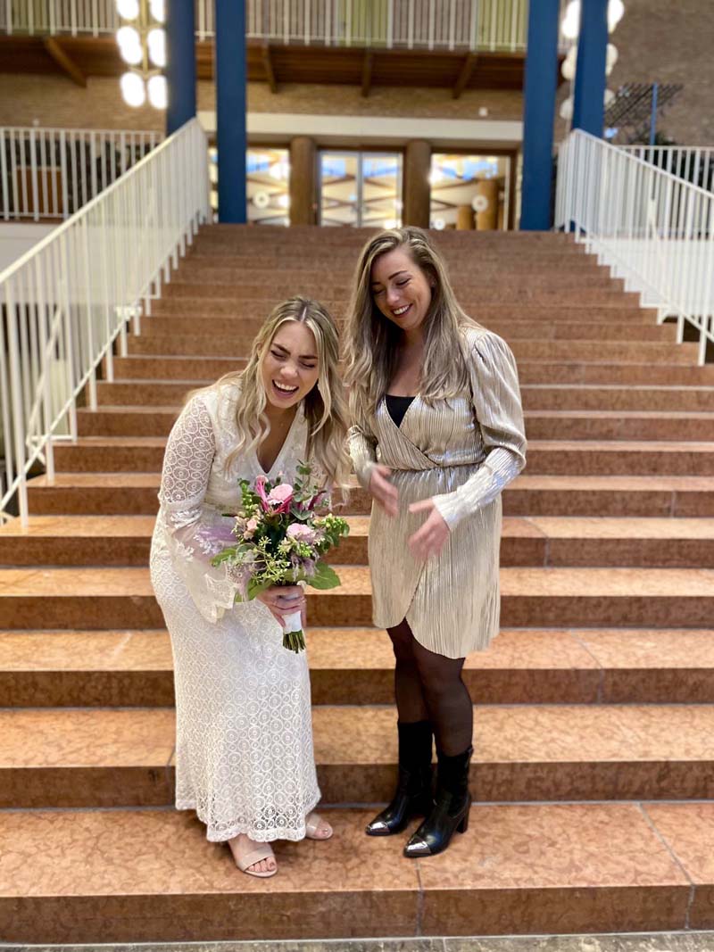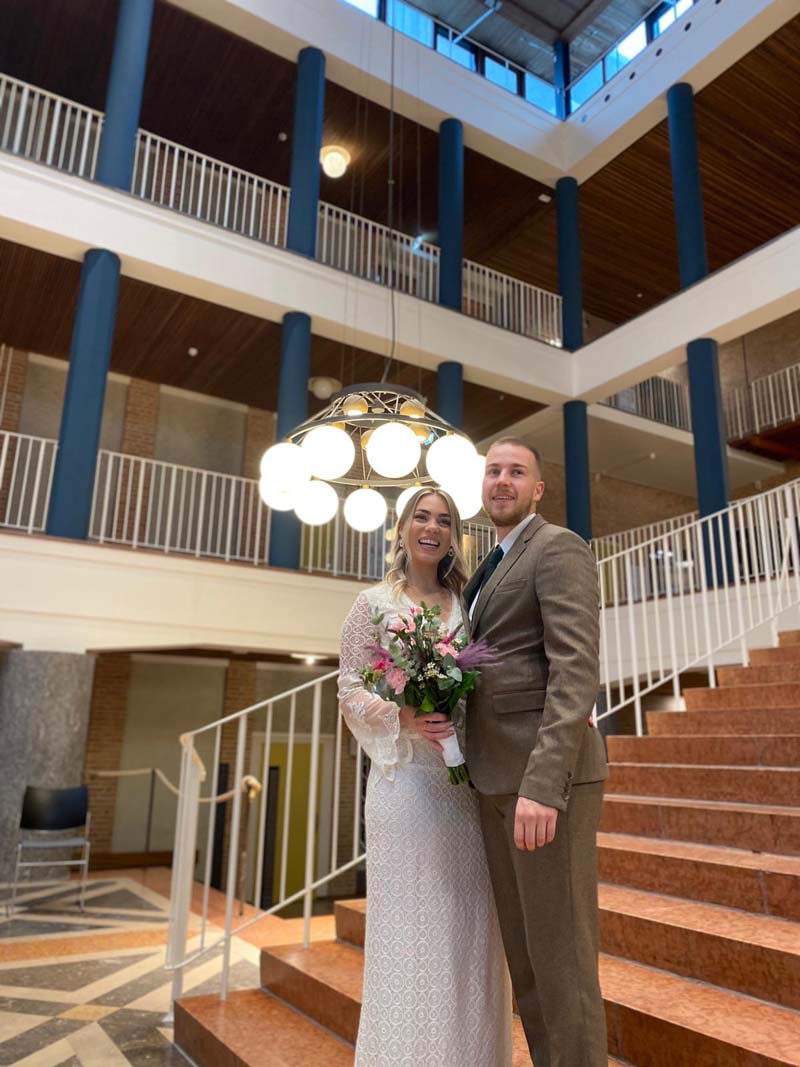 Nadat we beide klaar waren gingen naar het gemeentehuis. Ik was mijn boeketje vergeten (preggobrain) dus we moesten ook nog terug haha, oeps. Gelukkig waren we ruim op tijd. We hebben bewust gekozen voor het moment om gratis te trouwen, dus normaal zit je dan in een sober kantoor. Voor het eerst hadden we voordeel bij Corona, want het kantoortje was te klein en daarom mochten we in de echte trouwzaal. De ambtenaar die ons trouwde was ook nog zo vriendelijk dat de aanhang van de getuigen ook mee naar binnen mochten, iets wat normaal dan ook niet mag. Ook gaf hij ons ruim de tijd om voor en na de tijd nog wat foto’s te maken. Het voelde helemaal niet als een snel en gratis moment. Het voelde heel bijzonder om echt JA tegen elkaar te zeggen.