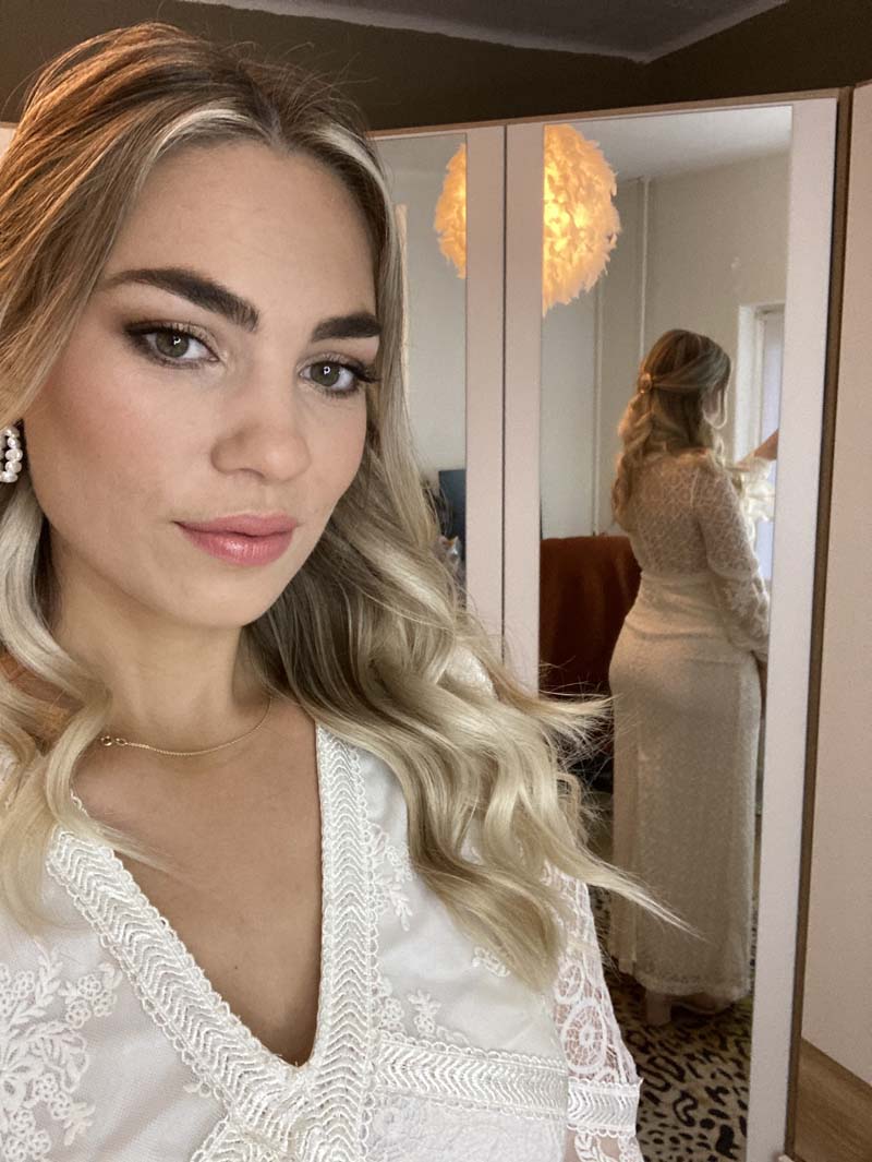 Mijn make-up heb ik opgebouwd zoals ik dat voor andere bruidjes ook doe. Met extra goed focus op houdbaarheid. Ik koos voor brons en goudkleuren die ik mooi vond passen bij het vintage gevoel van de jurk.