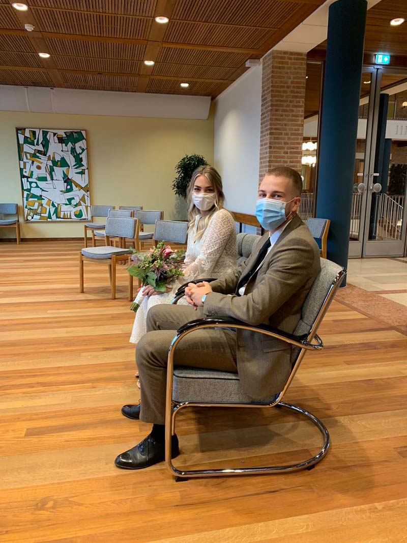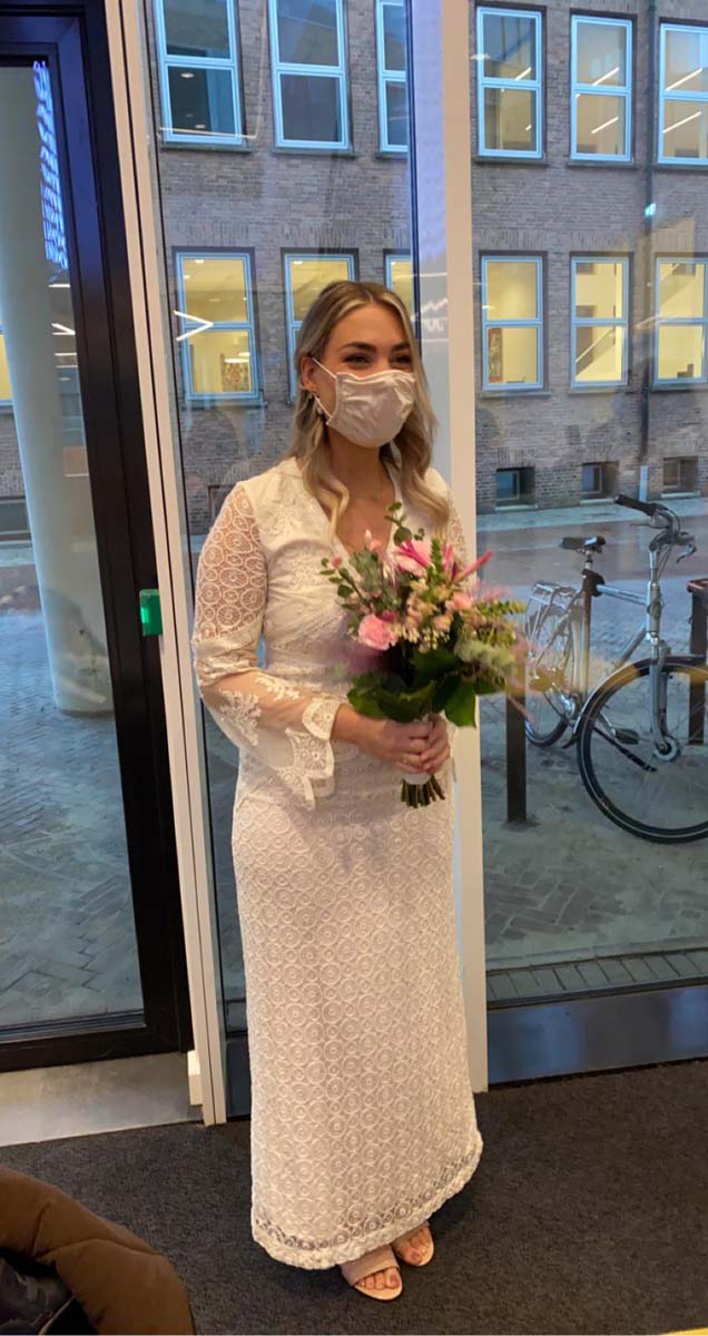 Corona bruidje. Ik had uiteraard wel gezorgd voor een off-white mondkapje die bij de jurk paste.