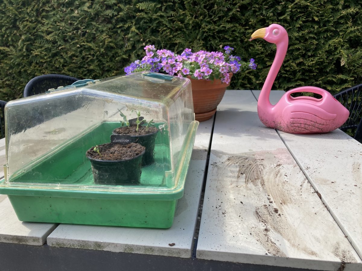 De moestuintjes van Albert Heijn gingen dit jaar niet zo heel lekker behalve de zonnebloem en de peultjes. Deze behandel ik dan ook maar liefdevol. Het heeft iets rustgevends hè, een beetje zo aanrommelen in de tuin. Met je handen bezig zijn in het zonnetje.
