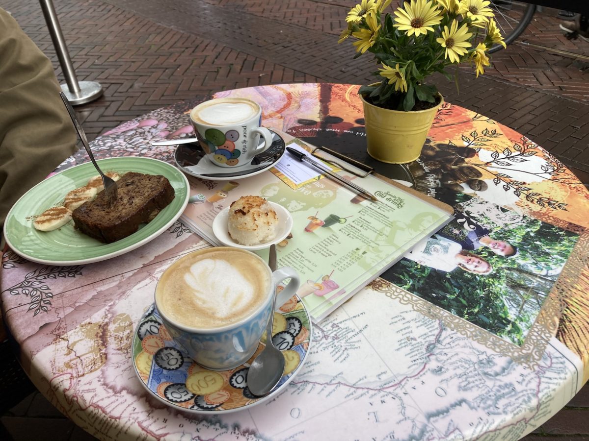 De behoefte aan het terrassen inhalen was zo groot dat we zelfs in de regen nog plaatsnamen bij Bagels & Beans in Enschede. In Hengelo was het droog maar onderweg op de scooter reden we een bui in. Hier zaten we nog net onder een luifel maar de halve tafel was wel gewoon kletsnat. Haha ik denk dat we hier over 10 jaar enorm om lachen, dat we zelfs in de regen nog op een terras gingen zitten. Krijg spontaan weer zin in deze heerlijke kokosmakroon… en ik ga nú een cappuccino voor mezelf maken. Joe!