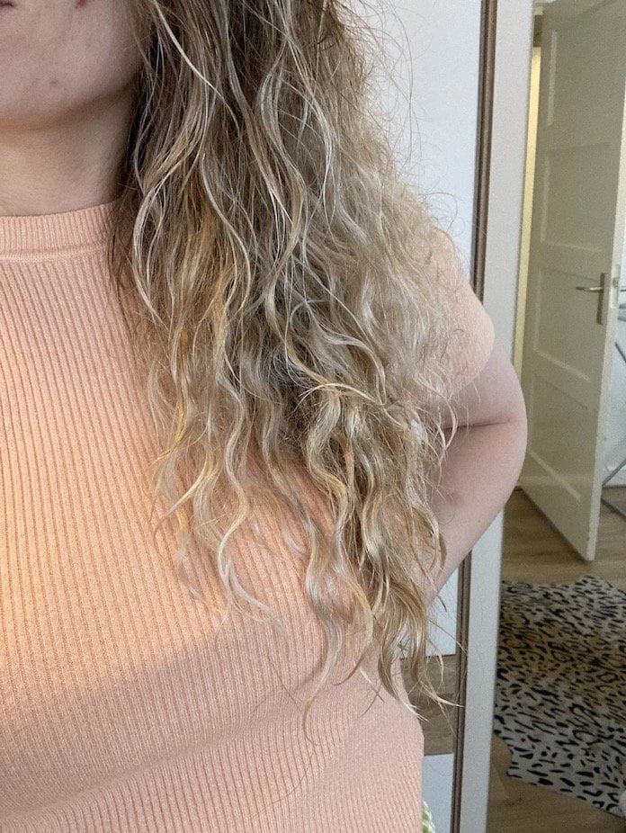 Ten eerste, bizar dat mijn haar in natte toestand ineens echt krullen heeft. Zodra ik het borstel is het ook voorbij, maar ze zitten er in eerste instantie wel in. Ik kreeg via Instagram (@emmystudiomint) echt een miljoen dm’s die mij wezen op the curly girl method, dus dit moet ik nog maar eens proberen om te zien of het daadwerkelijk wat kan worden.