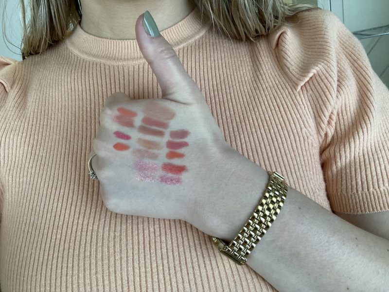 De tweede foto is mijn tactiek als ik een specifieke kleur lipstick in mijn hoofd heb. Ik wilde echt graag een peachy kleur die bij mijn top zou passen maar alles was te oranje of te bruin. Uiteindelijk voor een hele nude transparante kleur gegaan die het dichts bij mijn duim zit.