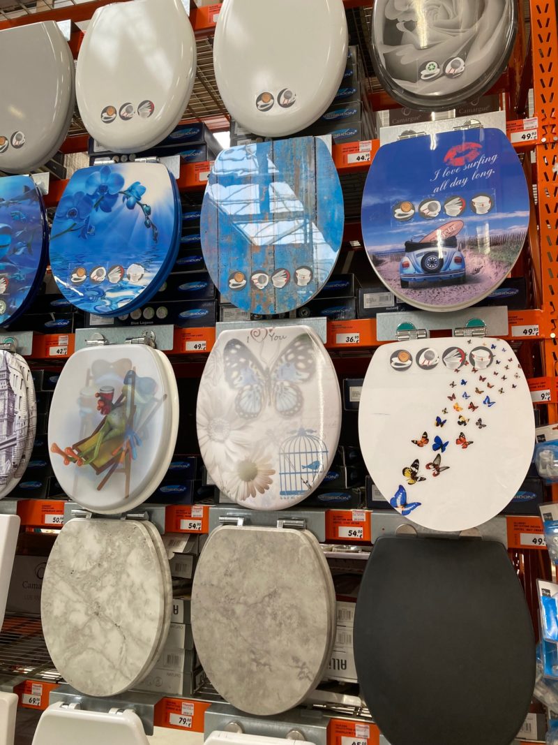 Bij Bauhaus stuitte ik op een afzichtelijke wand met allerlei wc-brillen. Sorry voor wanneer jij dit hebt 🙂