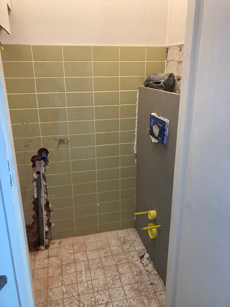 Ondertussen lakte ik wel het hele kozijn van de woonkamer, toen ging het echt al goed met me en de installateur maakte het begin van onze toiletruimte in orde. Ik heb er zo’n zin in om te zien hoe het is met tegels! Dit toilet krijgt roze rechthoekige tegels :O.
