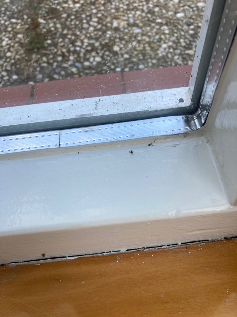 Dat kozijn, dat lakte ik met lak op terpentine basis. Daar komen dus echt een hele hoop vliegjes op af en die blijven steken in de natte verf! Zielig en irritant. Je kan ze er gemakkelijk afkrabben, maar het is dan toch net even weer een putje.