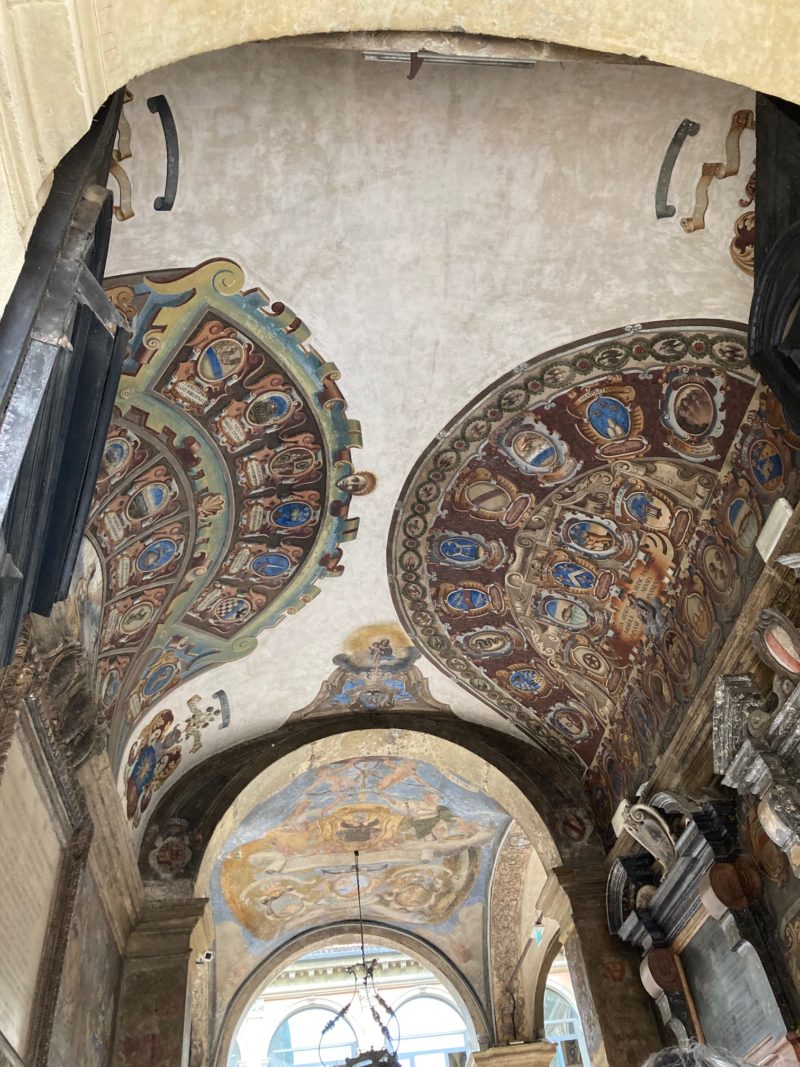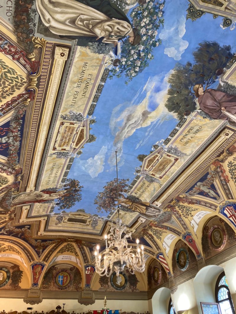 Op vrijdagavond kwamen we aan en toen was er een borrel georganiseerd met een pizza avond. Gelijk goed de Italiaanse sfeer erin! De volgende dag was er een ontbijt, waarna ik de make-up van de bruid ging doen en daarna snel mezelf. De ceremonie vond plaats in het gemeentehuis van Assisi, met een prachtig plafond zoals je ziet! Daarna gingen we terug voor taart, borrels en hapjes.