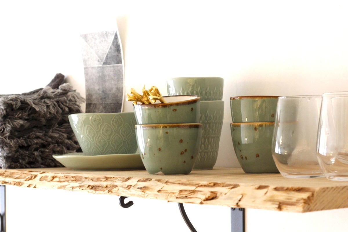Deze plank heb ik bij een houtzagerij op gehaald, en zelf afgeschuurd. De handdoekjes met franjes zijn van Action, de kopjes achteraan zijn van Ikea, de kopjes vooraan zijn van Loods5.