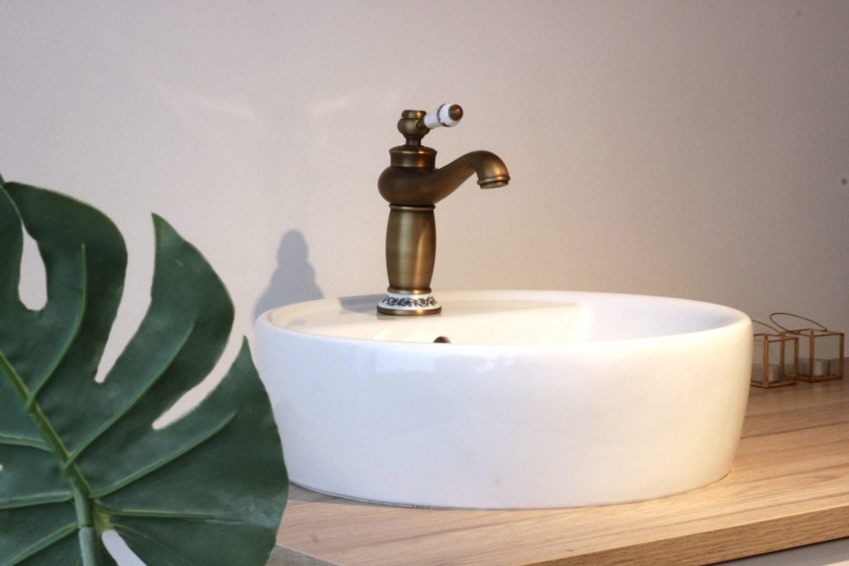 Ik koos voor een waskom in plaats van een verzonken wasbak. Ik heb alles in het goud afgewerkt wat maar metaal is, zelfs de schroeven. Een gouden kraan was nog een zoektocht, maar op Ali-express vond ik deze leuke.