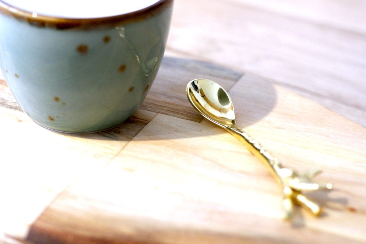 Hier nog een keer het kopje van Loods5. Daarbij een gouden lepeltje met een vogeltje aan het uiteinde van Sissy-Boy Homeland, op een klein houten plankje van Ikea.