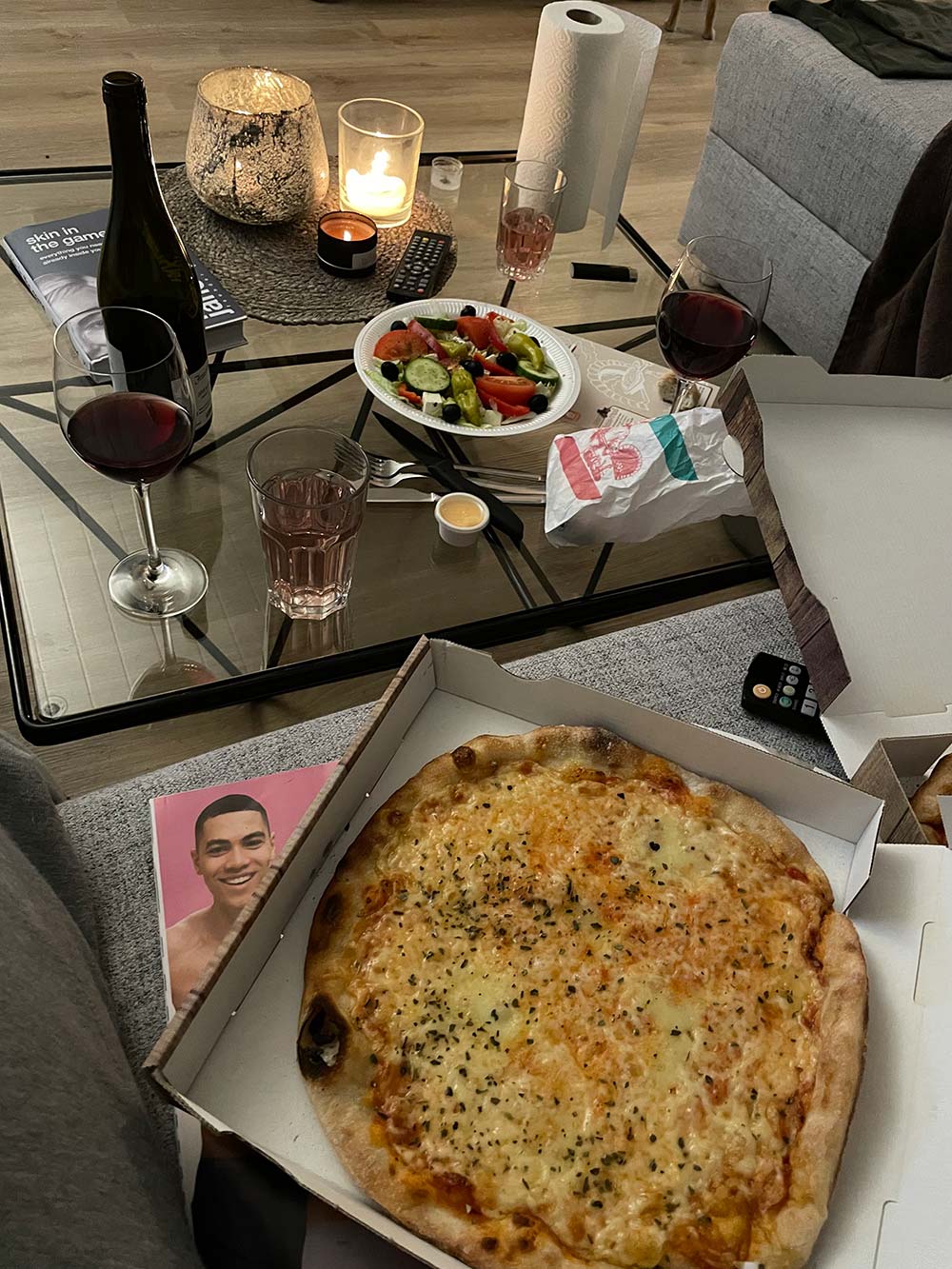 Weer thuis, wijn, chips en series.