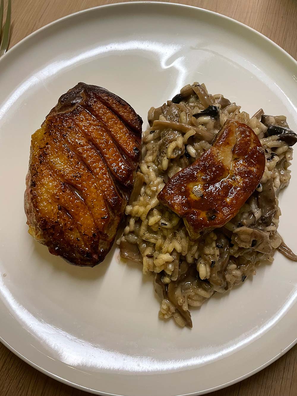 Eendenborst met eendenlever en paddenstoelenrisotto.