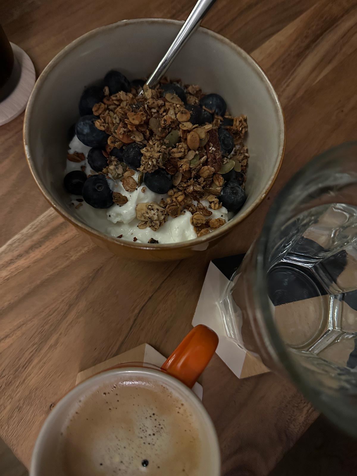 Ontbijt! Magere kwark met blauwe bessen en Oot granola.