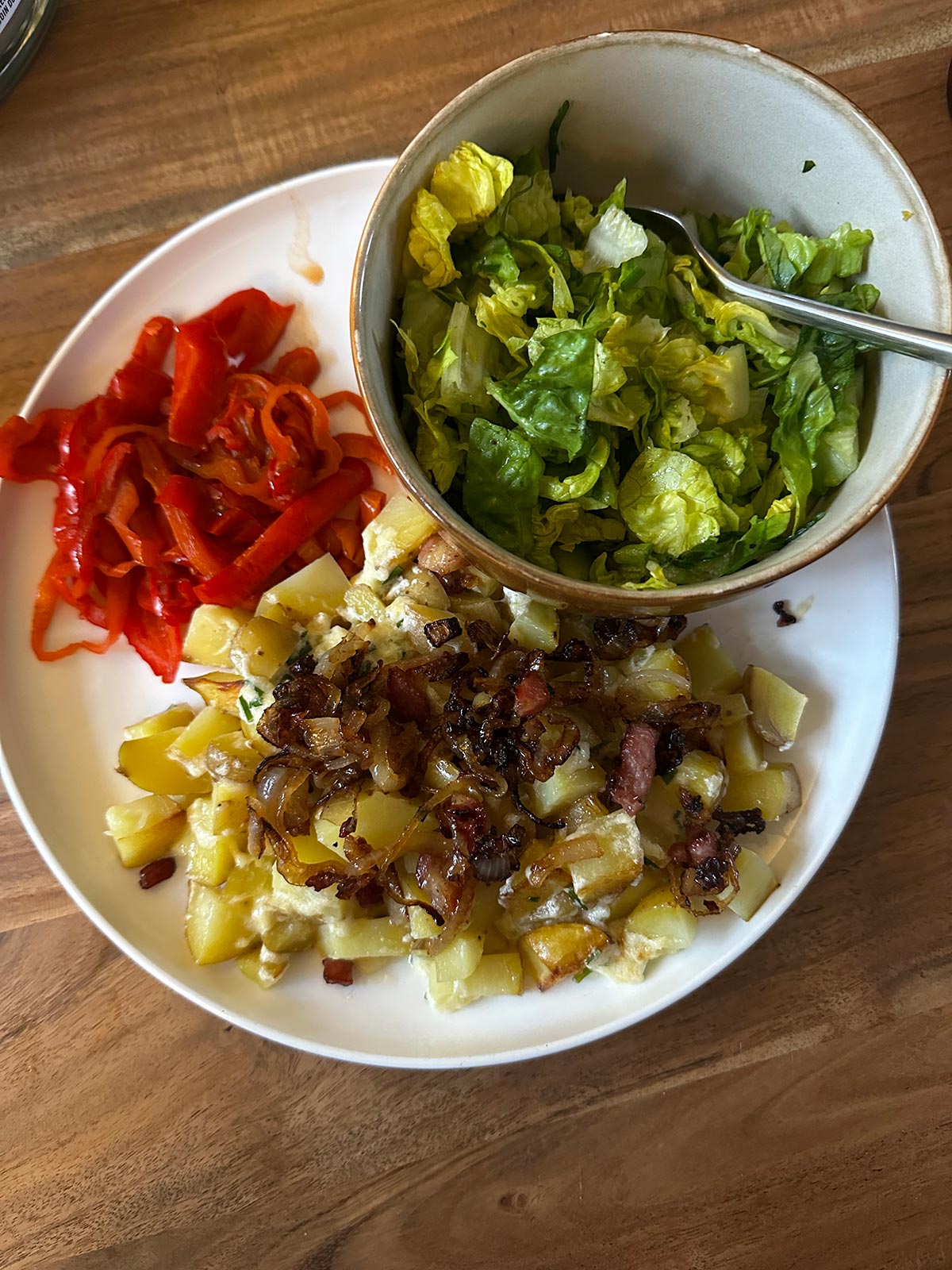 Gepofte aardappel met spek en zure room. Ziet er niet zo mooi uit, maar dit was echt zó lekker.