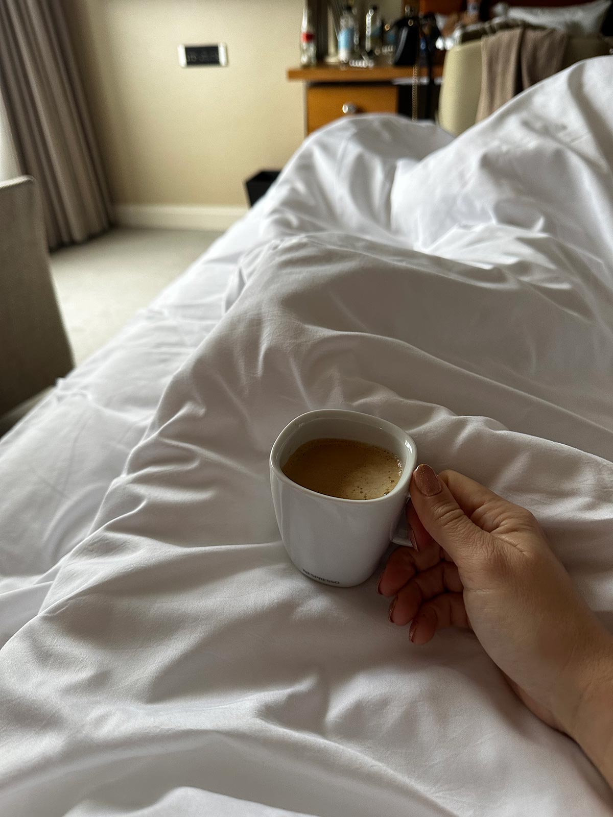 Goedemorgen. Ik word ontzettend brak wakker na 3 uurtjes slaap, zo blij dat alcohol het niet nog erger heeft gemaakt, haha. Even wakker worden met koffie in bed.
