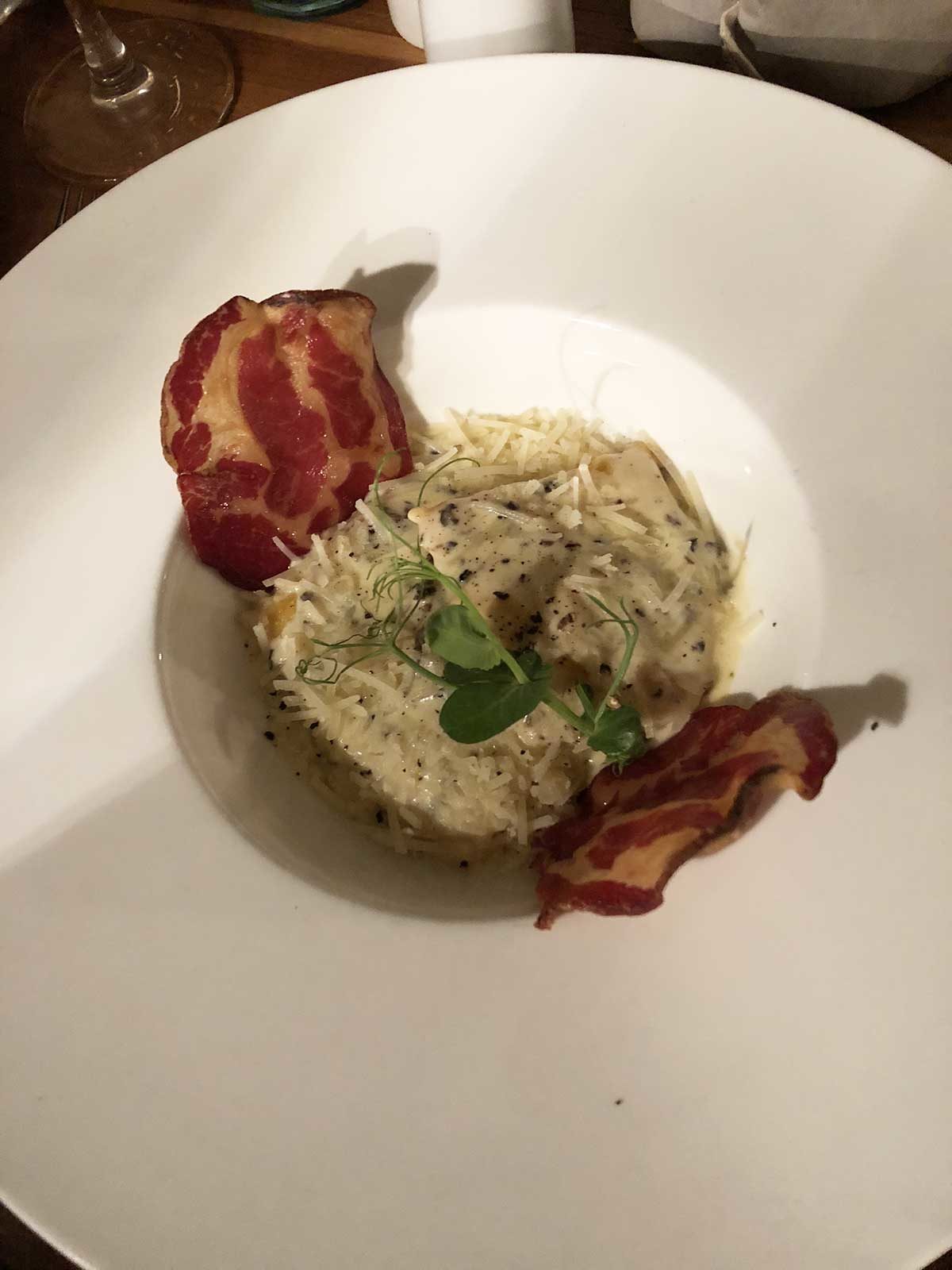 Elodie en ik delen allemaal verschillende gerechtjes. Dit is ravioli met truffel.