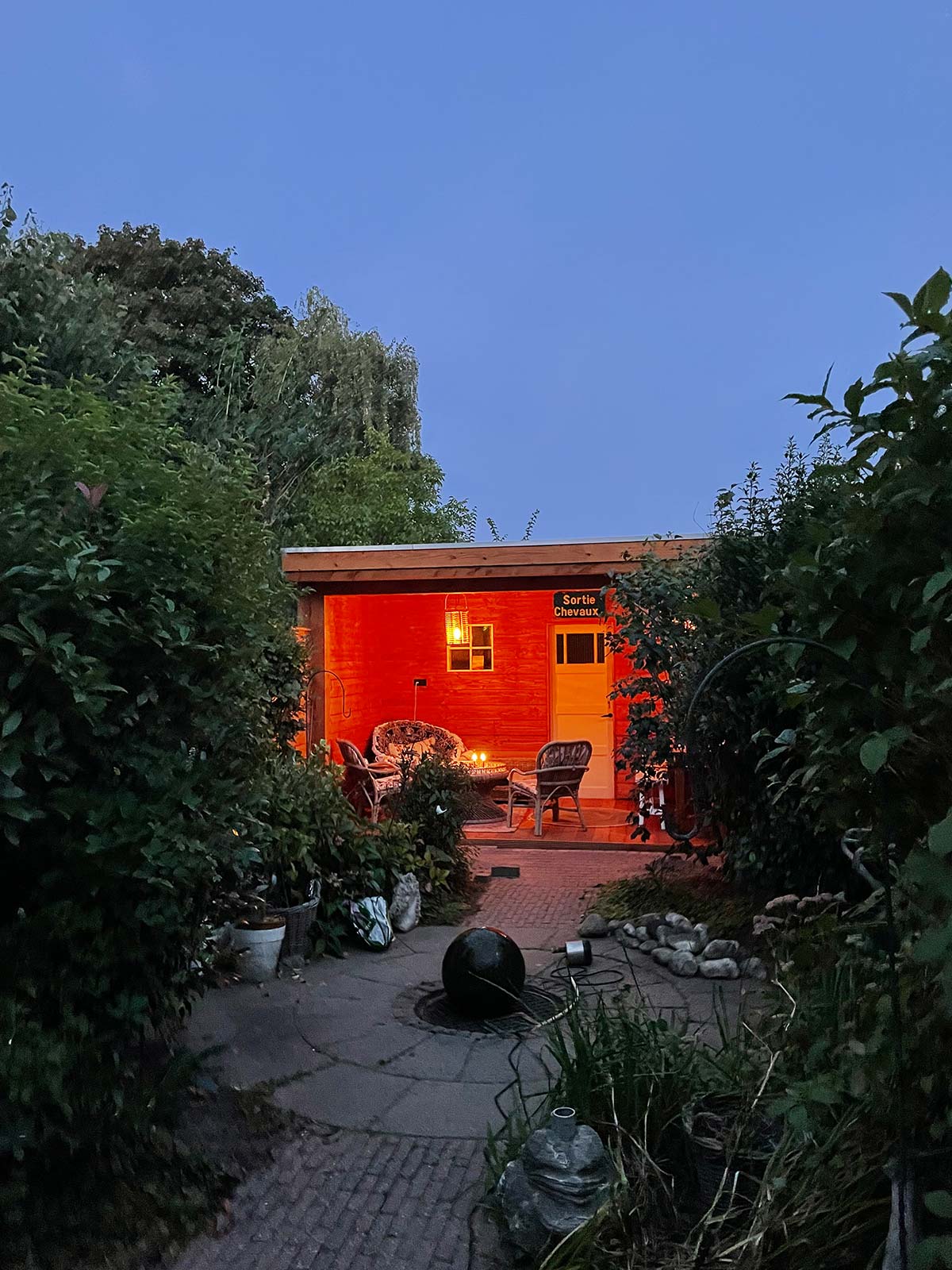 Bij Nina thee drinken en haar nieuwe veranda bekijken. Kees heeft meteen haar plekje gevonden.