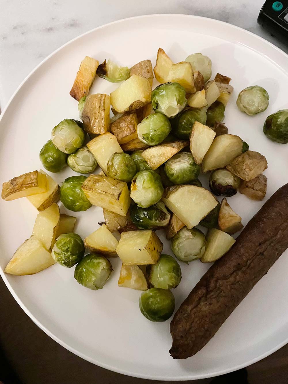 Traybake met aardappels, spruitjes en vega bratwurst.