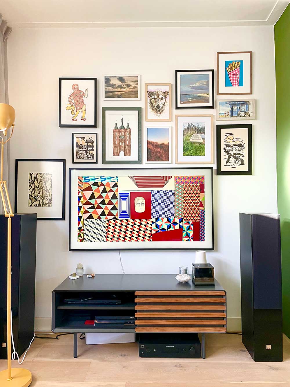 Het resultaat! Het is nog niet helemaal af, want we willen ook nog lijsten op de schouw hebben, maar dan moeten we eerst nog wat nieuwe kunstwerkjes verzamelen. Ik zal later wel meer vertellen over wat hier allemaal hangt. De televisie is trouwens Samsung the Frame.