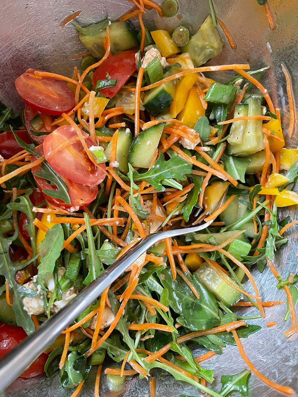 Lunchen met 350 gram groenten en dan ook nog eens heel lekker, love it. Ik maak deze salade met rucola, tomaatjes, komkommer, paprika, bosui, beetje geitenkaas, geroosterde pistachenoten, olijfolie, balsamico en peper en zout.