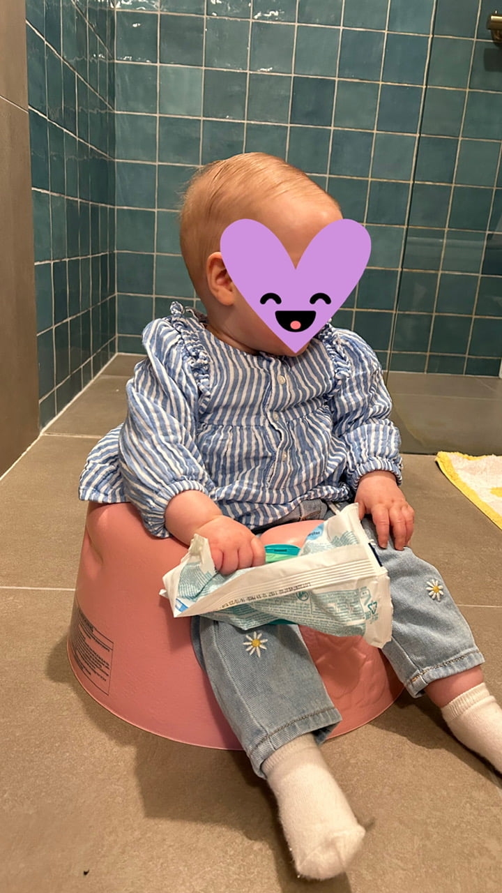 Soms is het al huilen als ik de hoek omloop, dus als ik even wat moet doen in de badkamer en ik ben met haar alleen, dan zet ik haar even neer in dit Bumbo stoeltje met een pak doekjes in haar handen. Is de meid helemaal gelukkig. Het is net alsof ze op een potje zit met haar broek nog aan haha, is dus niet zo.