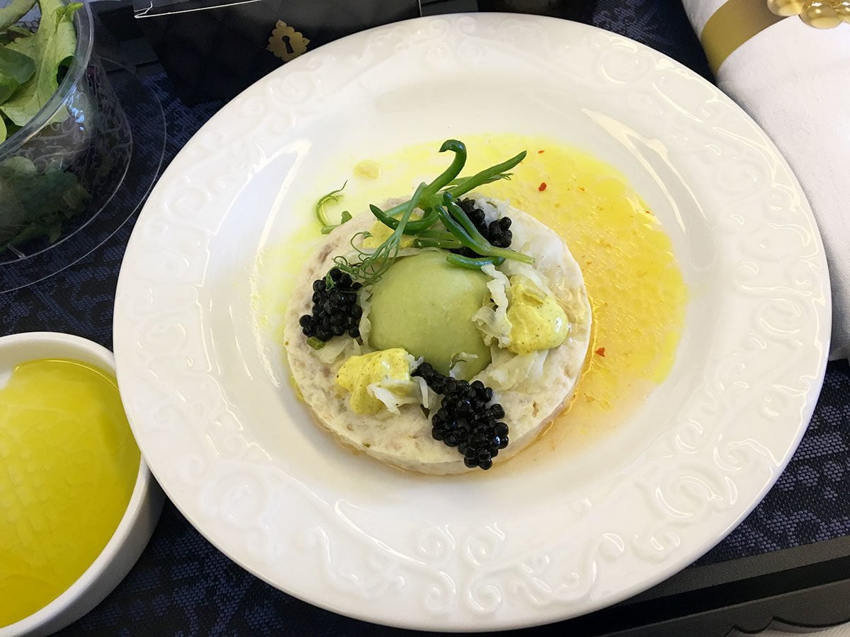 Mijn voorgerecht is gerookte tonijn en het is zó lekker! Ik verwachtte er toch niet zoveel van, het blijft vliegtuig eten, maar dit smaakt alsof ik in een restaurant zit te eten. Wat heerlijk!
