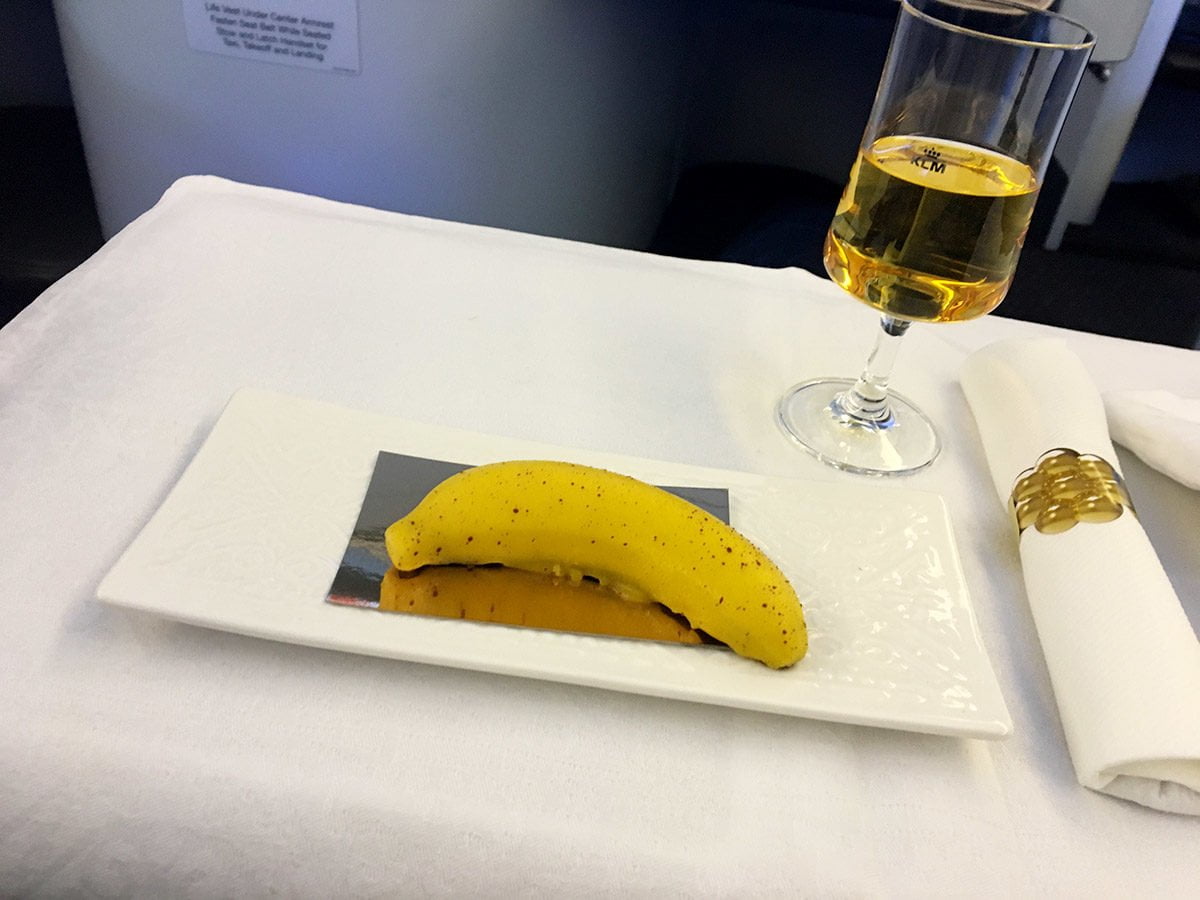 Een paar dingen vallen me op: het méga vriendelijke personeel en het eten. Ik vind KLM-personeel altijd al erg aardig, maar het is duidelijk dat ze in Business Class een stapje extra zetten. Ik krijg veel persoonlijke aandacht en ze nemen alle tijd. Dat kan natuurlijk ook beter in een Business Class cabine: er zijn veel minder passagiers dan in een Economy Class cabine. Ik heb met alle stewardessen wel een gesprekje gevoerd en het voelde heel relaxed en niet geforceerd.