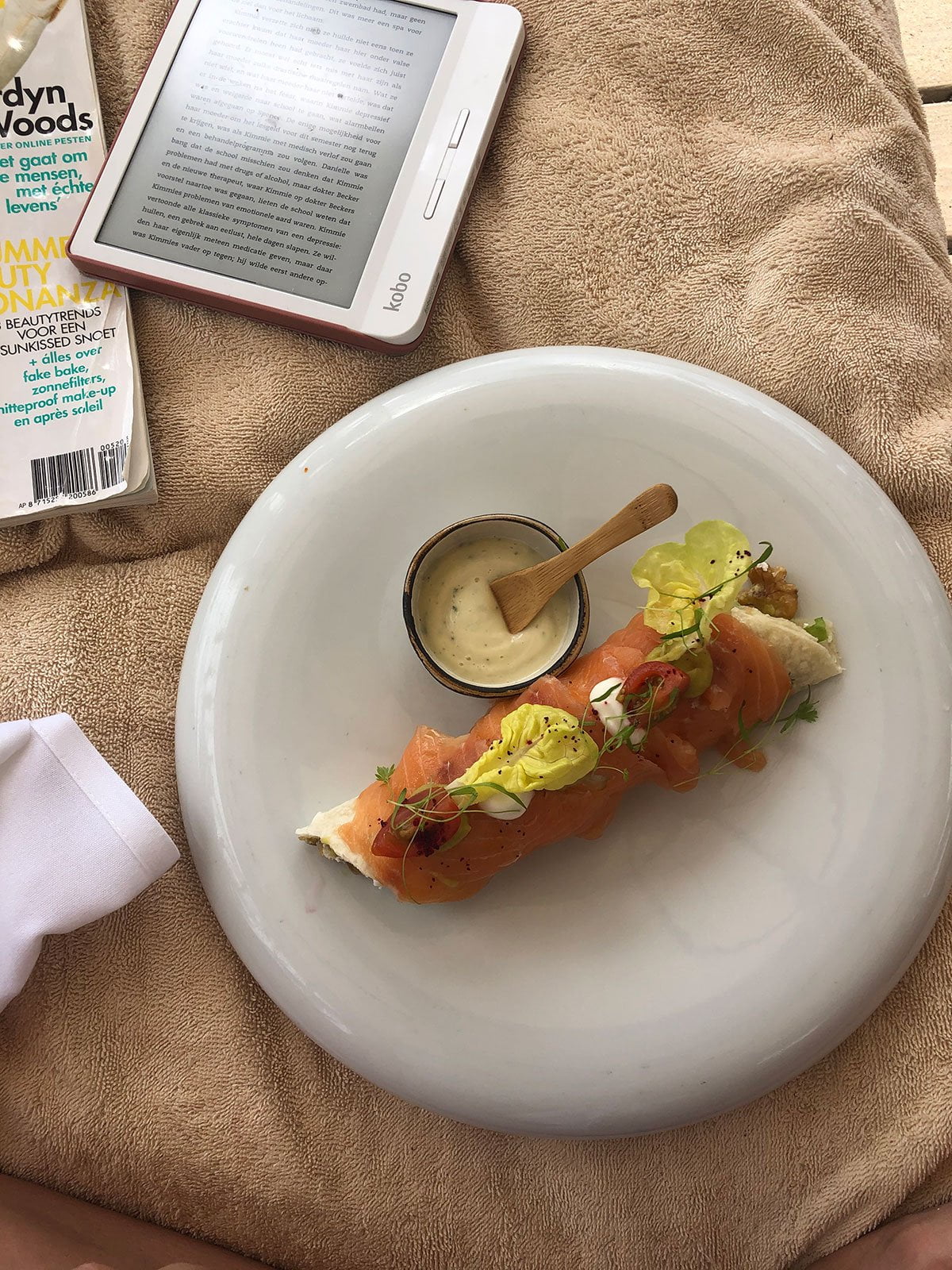 Lunchen op ons strandbedje met een wrap met zalm en avocado.
