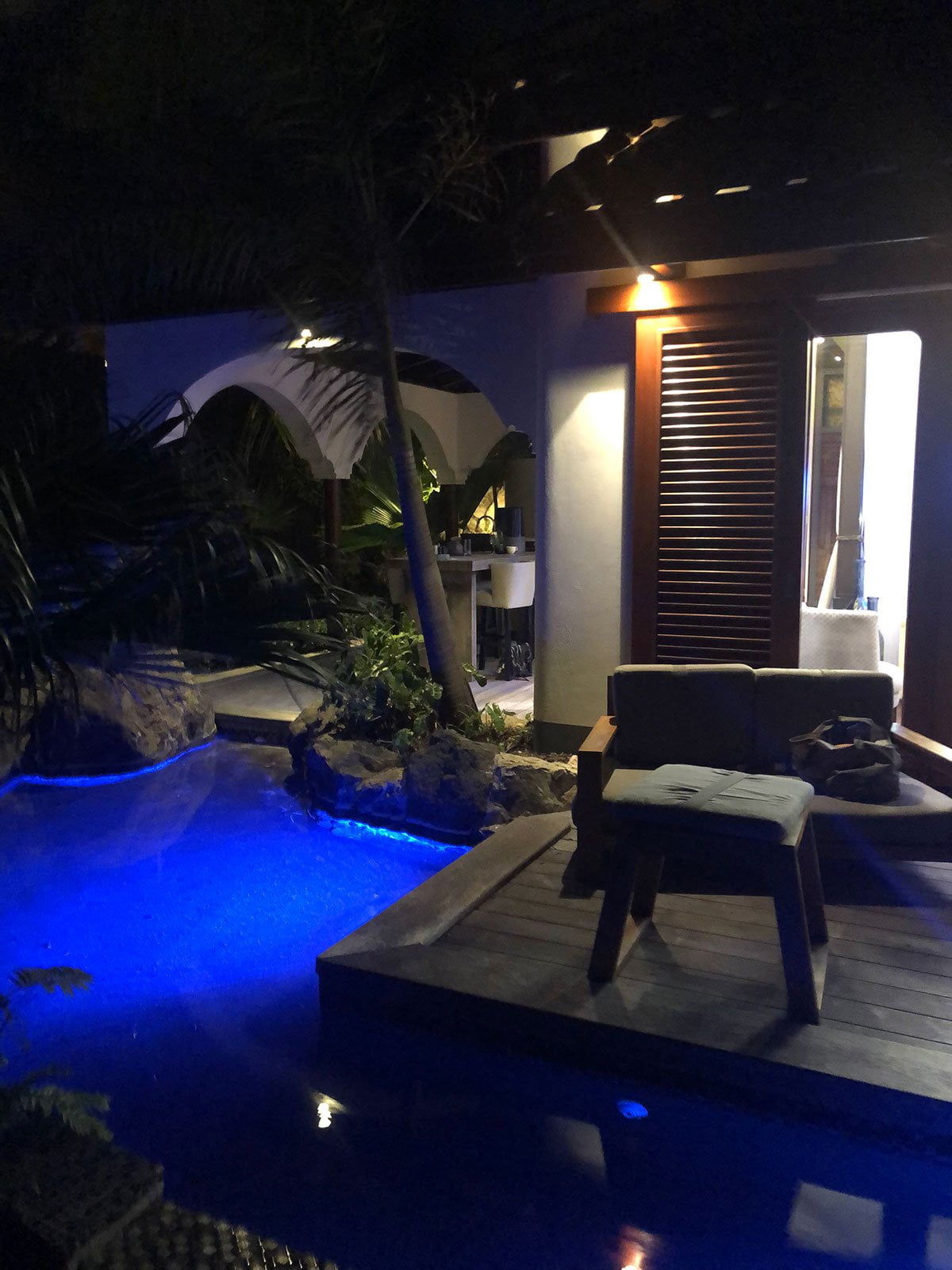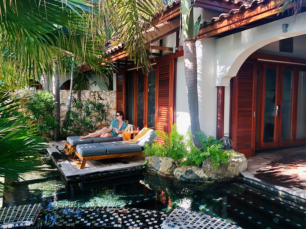 We kregen een upgrade van een kamer naar een Beachfront Pool Suite, eigenlijk een eigen huis met een privé zwembad en een ruime tuin. Sommige van deze Beachfront Pool Suites hebben een privéstrand, anderen hebben een eigen toegang tot het strand van het resort en anderen hebben een jacuzzi.