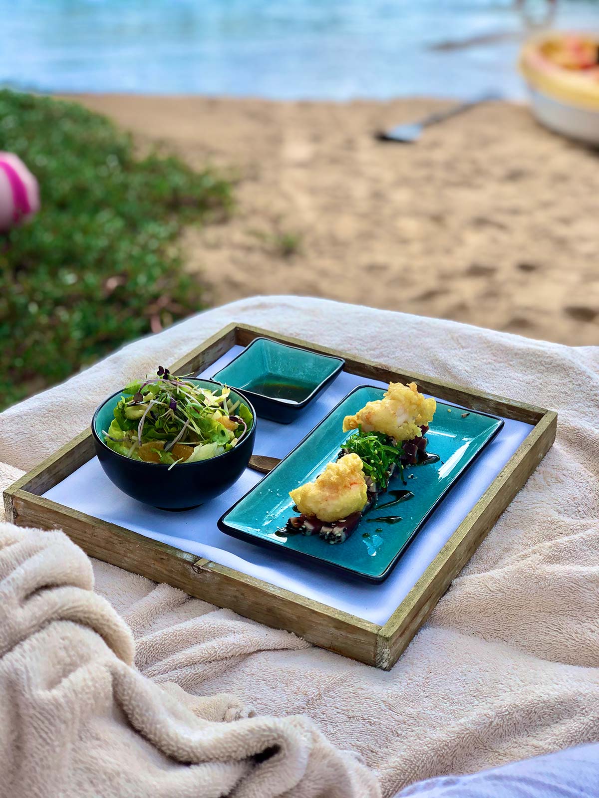 Superchique lunch bij Baoase, tonijn met garnaal en salade.