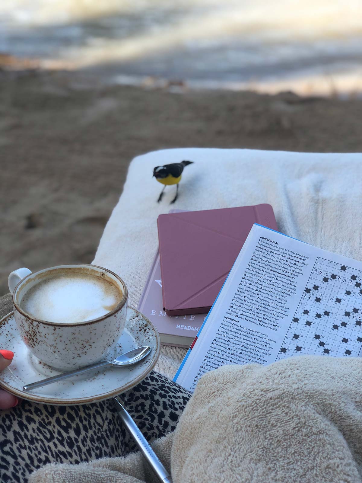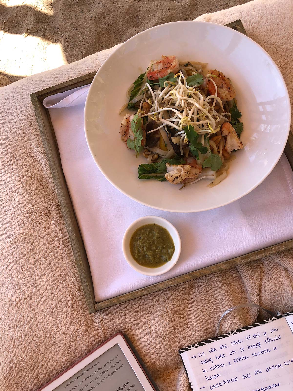 Och. Dit. Op zo’n superzacht bedje, afgekoeld door het zwemmen, koud sapje, boek, uitzicht op zee, geluiden van vogels om me heen, lekker rustig…